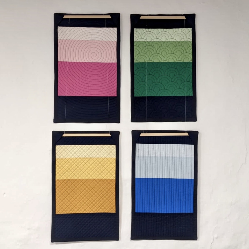 They are quilted matching the background motif. The Spring with a spiral, which starts in a special point (keep reading), the Summer with a Baptist Fun motif to recreate the sea waves, the Autumn with a diagonal grid to match the asanoha Japanese motif and for the Winter, vertical lines to remind us the vertical direction of the snow falling from the sky.