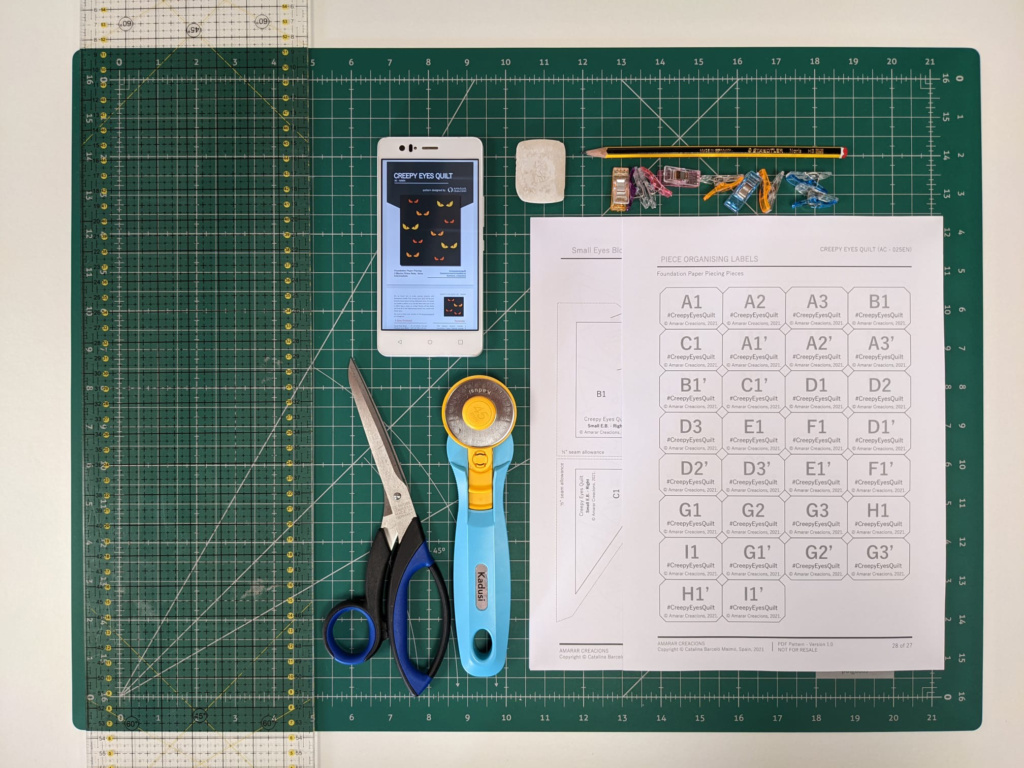 El primer que necessites per fer el teu projecte Creepy Eyes és el patró. Per celebrar el llançament d’aquest patró, tots els meus patrons tenen un 15% de descompte fins el 10 d’octubre, però com que vull ajudar-te a participar en aquest Quilt-Along, he estès el 15% de descompte del patró Creepy Eyes fins a la finalització del QAL. Per tant, pots obtenir el patró Creepy Eyes Quilt amb el descompte durant el QAL i unir-se a nosaltres en qualsevol moment.