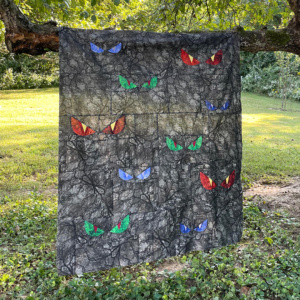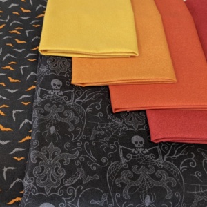 Per al QAL, faré una versió com la manta mida nadó com la del patró, però utilitzaré diferents teles. Per a aquesta versió he triat un fons de teixits Andover, Midnight Haunt – Spooky Damask Night. I per als ulls, el pol·len, la flama, la rosella i el rubí de la col·lecció Phospore 21 de Libs Elliot. Per la tela d’abaix del sandwhich, utilitzaré Midnight Haunt – Night Flight Inky d’Andover.