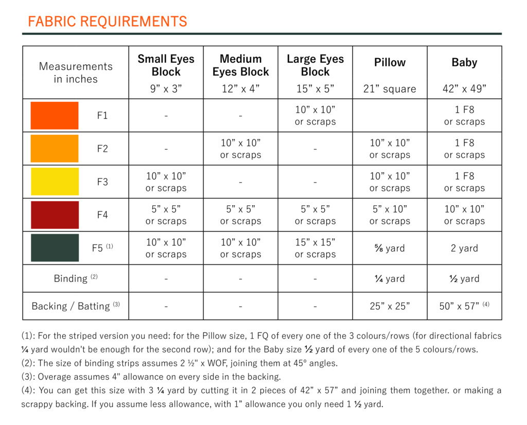 El patró proporciona mesures en sistemes mètriques i imperials. Com he explicat al patró, les mesures en mètriques no són traduccions exactes de les imperials, les he adaptat perquè siguin fàcils de tallar les peces. Per tant, en mètriques tindreu un projecte acabat un poc més petit que en imperial, però no gaire. Per exemple: la mida del nadó serà de 105 cm x 122,5 cm i la seva mida cosit amb les mesures imperials serà de 106,68 x 124,46 cm. La diferència és tan petita que val la pena fer servir les mètriques si hi esteu més avesats.