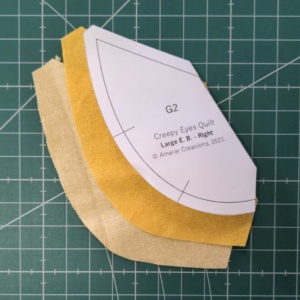 1. Els ulls: es cosiran amb Foundation paper piecing, i necessitem una plantilla de Foundation paper piecing per a cada ull (a no ser que estiguis utilitzant la tècnica de el paper de congelador ( “Freezer paper”), que si no saps el que és consulta meu tutorial).