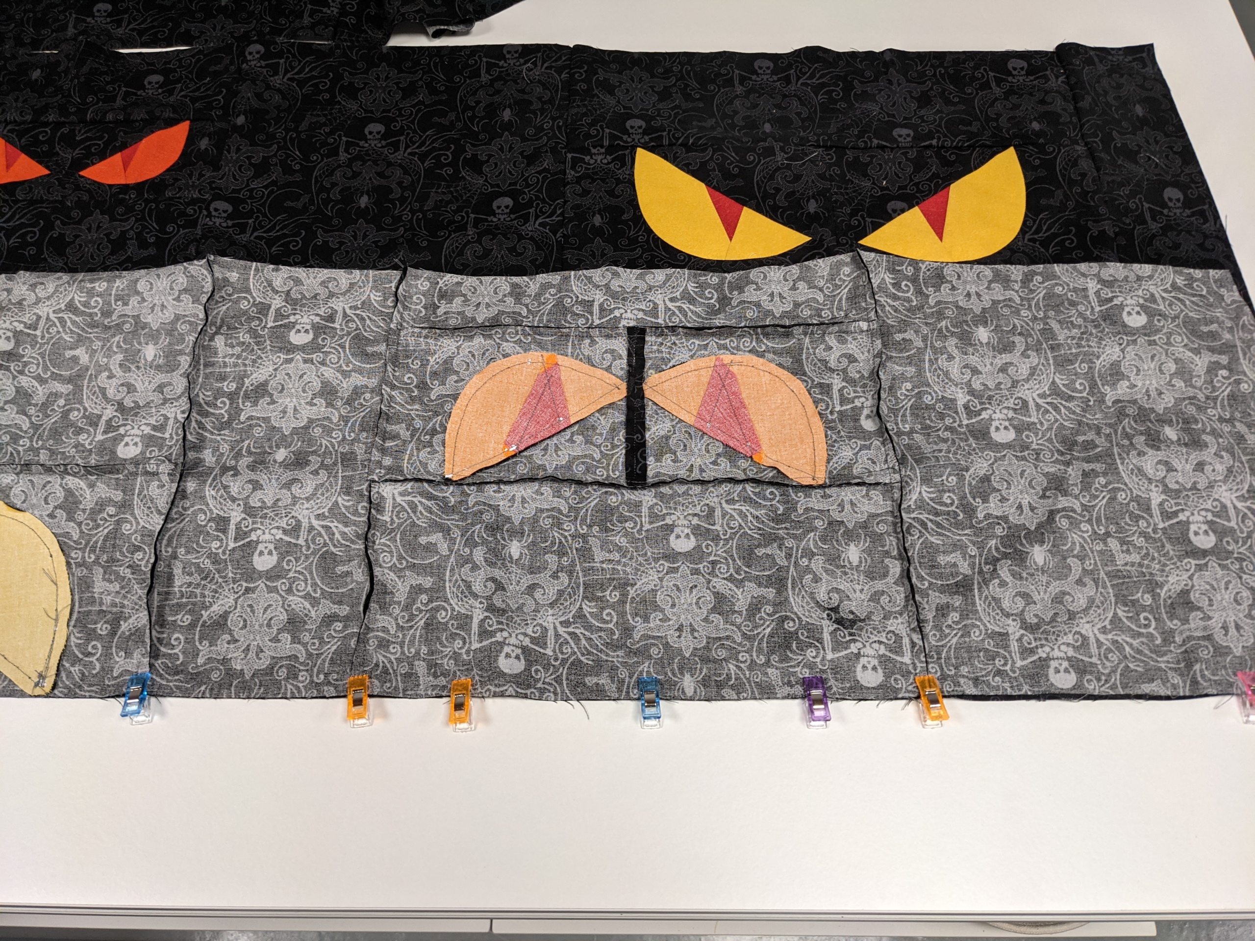 El darrer pas per a finalitzar la part superior del quilt (top) és unir els blocs d’ulls a les peces de fons. Aquest pas és realment senzill, ja que no hi ha blocs a fer coincidir amb precissió.