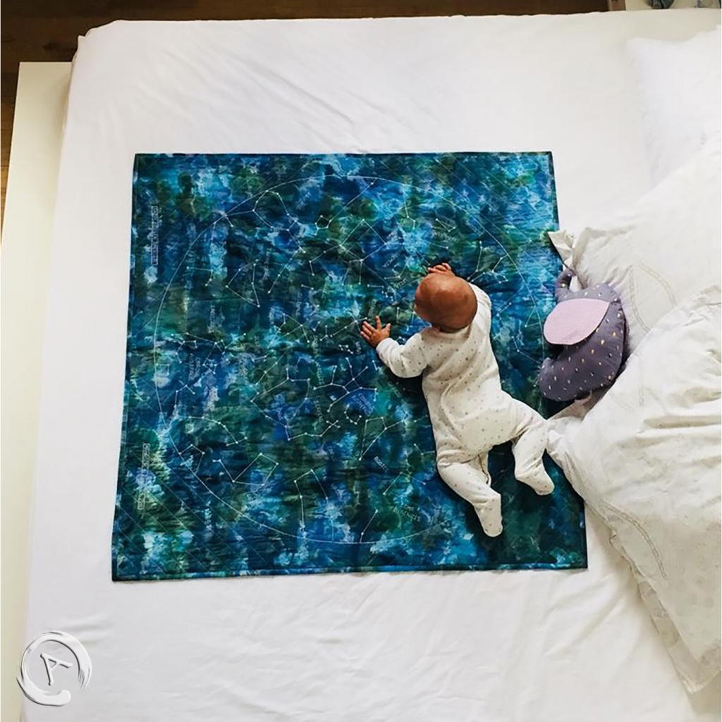 Inspirada en aquests pensaments he ideat la meva darrera creació. Una manta que immortalitza un mapa estel·lar en un lloc, data i moment determinat. A cada moment, les vegem o no, les estrelles que ens acompanyen canvien. Amb aquestes mantes vull immortalitzar aquest cosmos que ens acompanya en dates assenyades i importants de les nostres vides: naixements, aniversaris assenyalats, etc.