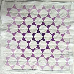 Després, va arribar la part en què vaig haver de pensar com muntar el patró. Al principi, estava pensant en fer-lo amb foundation paper piecing, però com que es podia fer amb triangles regulars, vaig decidir fer-lo amb assemblatge tradicional. La part de fer plantilles no va ser tant dura com semblava en un principi, i amb les plantilles de foundation paper piecing i un software de dibuix va ser relativament senzill. El més difícil va ser fer les cantonades angulades de manera que permetessin confrontar les teixits de la manera més senzilla. Aquesta idea em va venir al cap quan vaig fer una primera prova del q uilt en una mida més petita … la pitjor part va ser confrontar les teles per fer que el resultat fos precís i obtenir uns triangles perfectes, així que vaig buscar una manera d’angular les cantonades per fer-ho més fàcil i crec que ho vaig aconseguir!