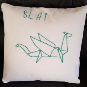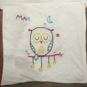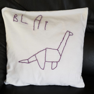 La idea era fer uns coixins amb un dibuix brodat a mà a cada banda, a una part un de la gran i a l’altra un de més senzill del menut. I he de contar-vos que ha estat tot un treball familiar perquè el papa va tallar les teles, els nins van calcar els dibuixos, tooots vàrem brodar (perquè no arribàvem a tenir-los acabats per dia 5 de gener) i jo vaig muntar els coixins, així que tot un treball en equip.
