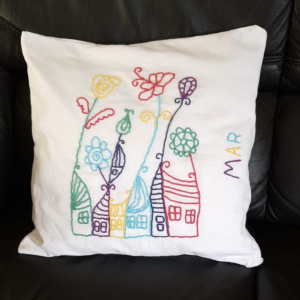 I aquí teniu els resultats, tres coixins de loneta blanca de cotó brodats amb fils de colors a cada banda. Un per cada padrins i un altre per la repadrina.