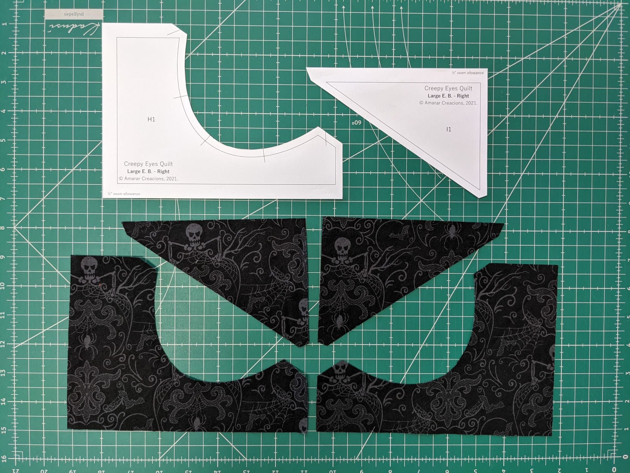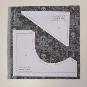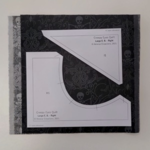 - The background of the Eye blocks, every eye has 2 background pieces, one curved piece. For those 2 pieces we need cutting templates. Since those pieces are mirrored in the 2 eyes of a block eye, we just need 1 of every one of every background piece. You will see below when we cut the fabrics.