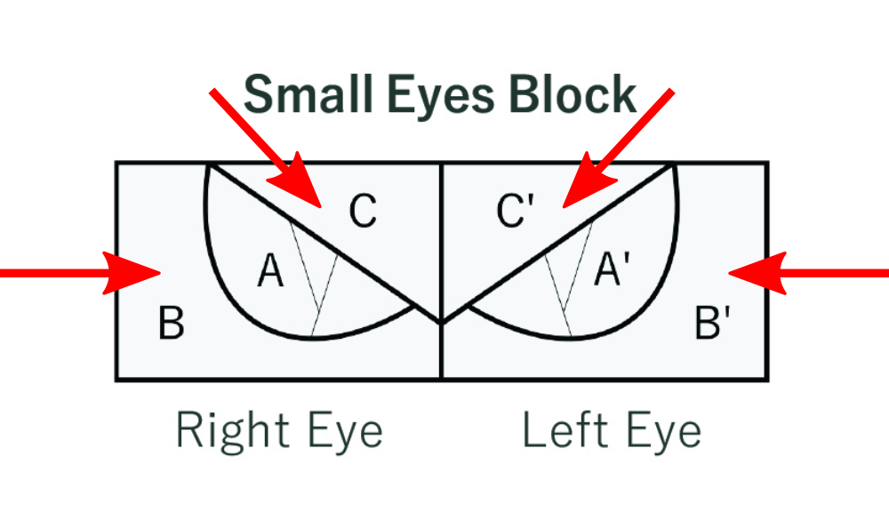 NOTICE: every Eyes block has 2 eyes, and they are mirrored. It means we can use the template for the right eye to cut the piece for right eye and left eye, just flipping the template. Another way to do it is placing two fabrics one over the other, one right side up and the other right side down and place the template over them.