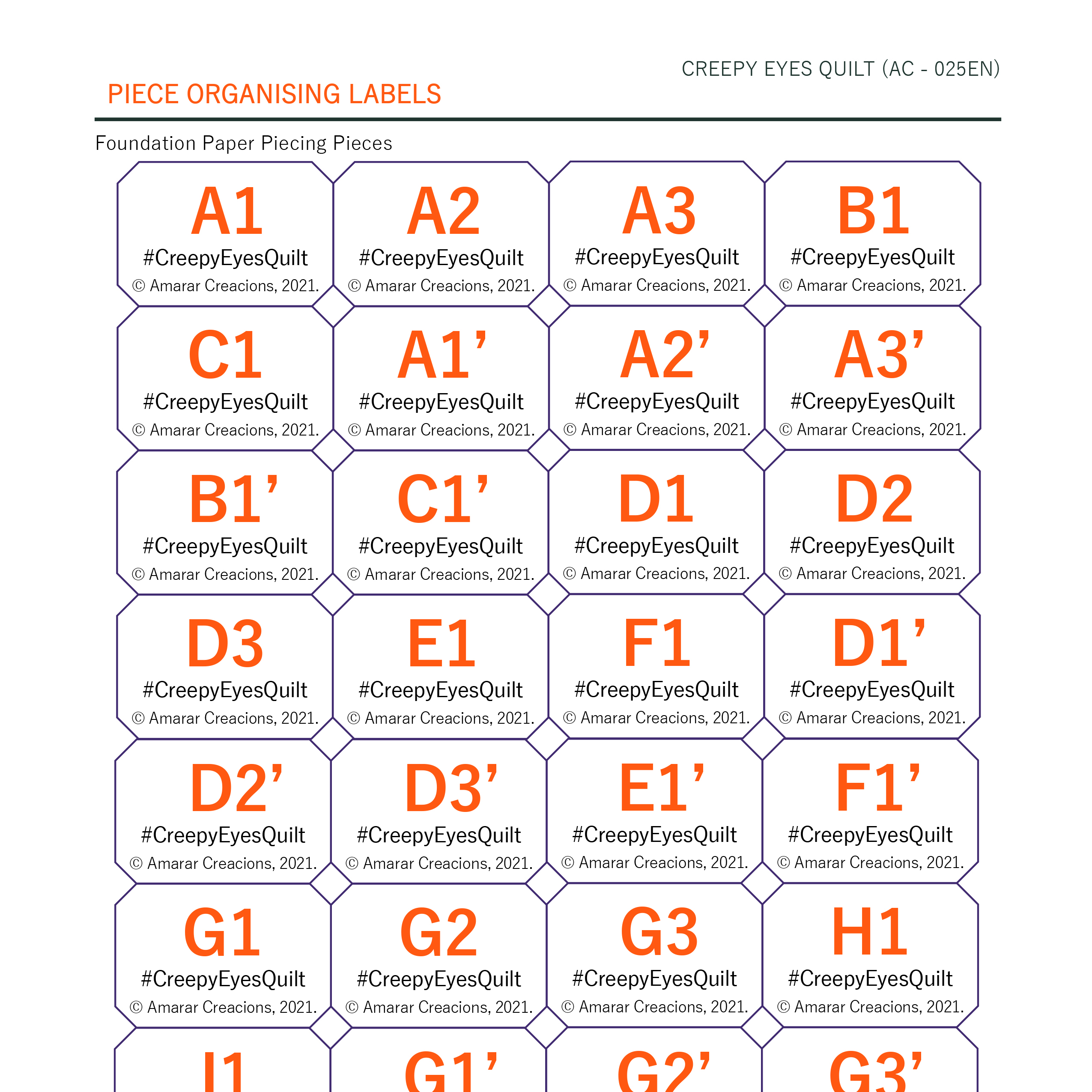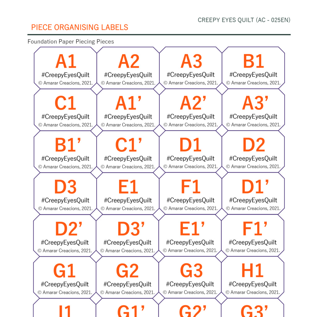 Since in this design there are a lot of different size pieces, I have included in the pattern organising labels for all the pieces we will sew. You can use all of them, but I think the ones for the background pieces are really important, and the ones for the foundation paper piecing can be avoided, since in this part the pieces have a shape that can make them easily distinguishable.