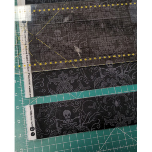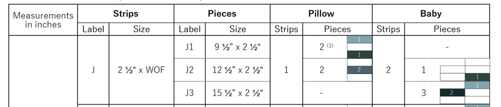 Here there is an example for the smallest strips. For the Baby siZe we need to cut two 2 1/2″ strips x WOF and then subcut them into one 12 1/2″ x 2 1/2″ and three 15 1/2″ x 2 1/2″. And we reserve the left fabric to cut later the background for the eyes blocks.