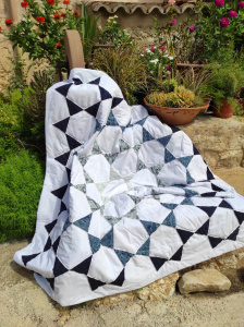 This pattern was an idea I had had in my head for a long time and never found the moment to see it done. The inspiration of the Starlike design comes from my love for maths and geometrics, and thinking in using the triangle shape, but not in regular shape. It was hard to draw the triangles in order to all the tips matches, but after making some maths I figured out how to do it and the idea became a real draw! It was very funny playing with colors and the little triangles… As you can see, the design is thought to make the pattern using 4 colours in a gradient way. The gradient can be made in many differents ways that makes many differents designs to come out. So, this is a higly customizing design that allows making very different quilts from the one I made with the same templates, only playing with colours.