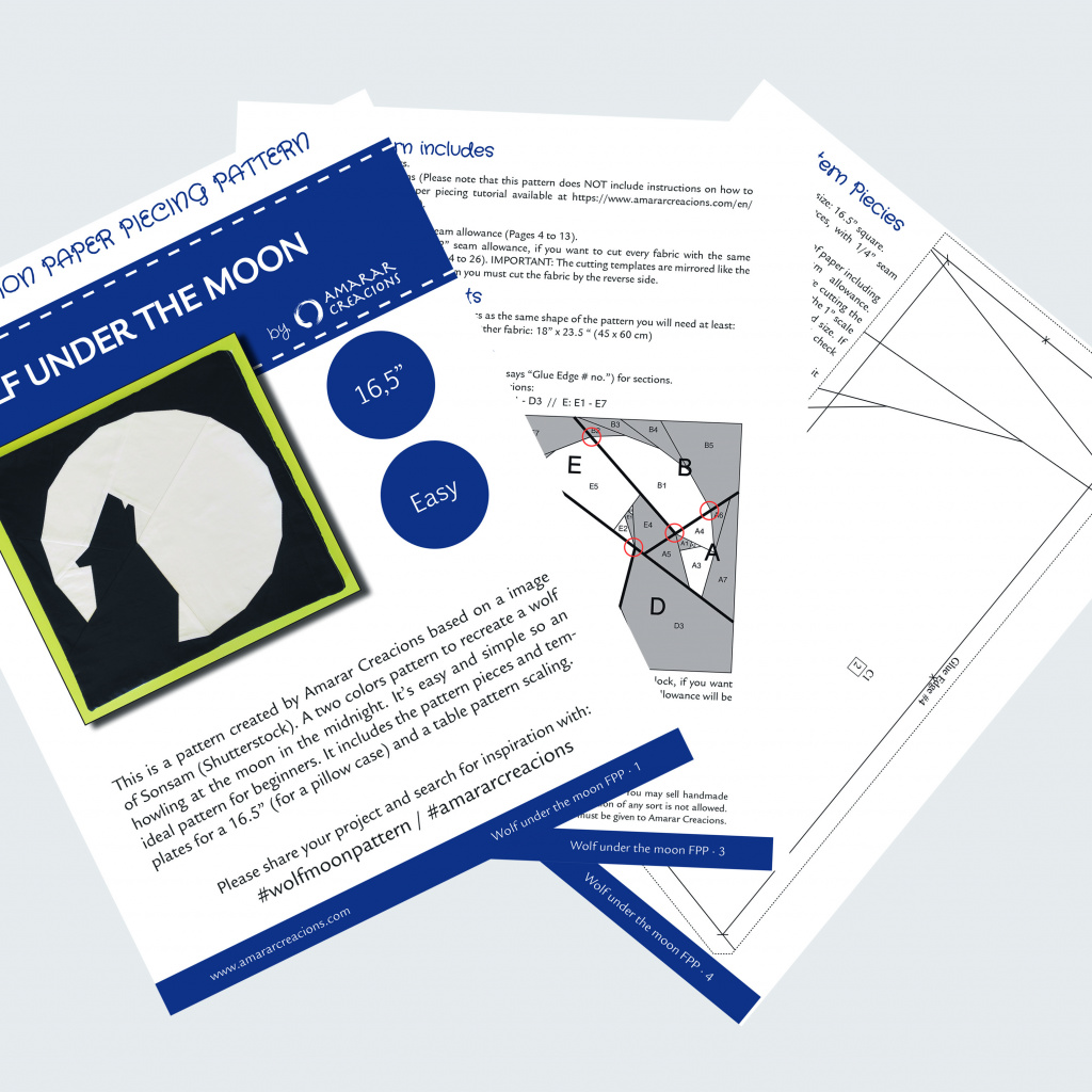 - Assembly instructions (Please note that this pattern does NOT include instructions on how to foundation piece, paper piecing tutorial available at https://www.amararcreacions.com/en/ tutorial-paper-piecing/).
