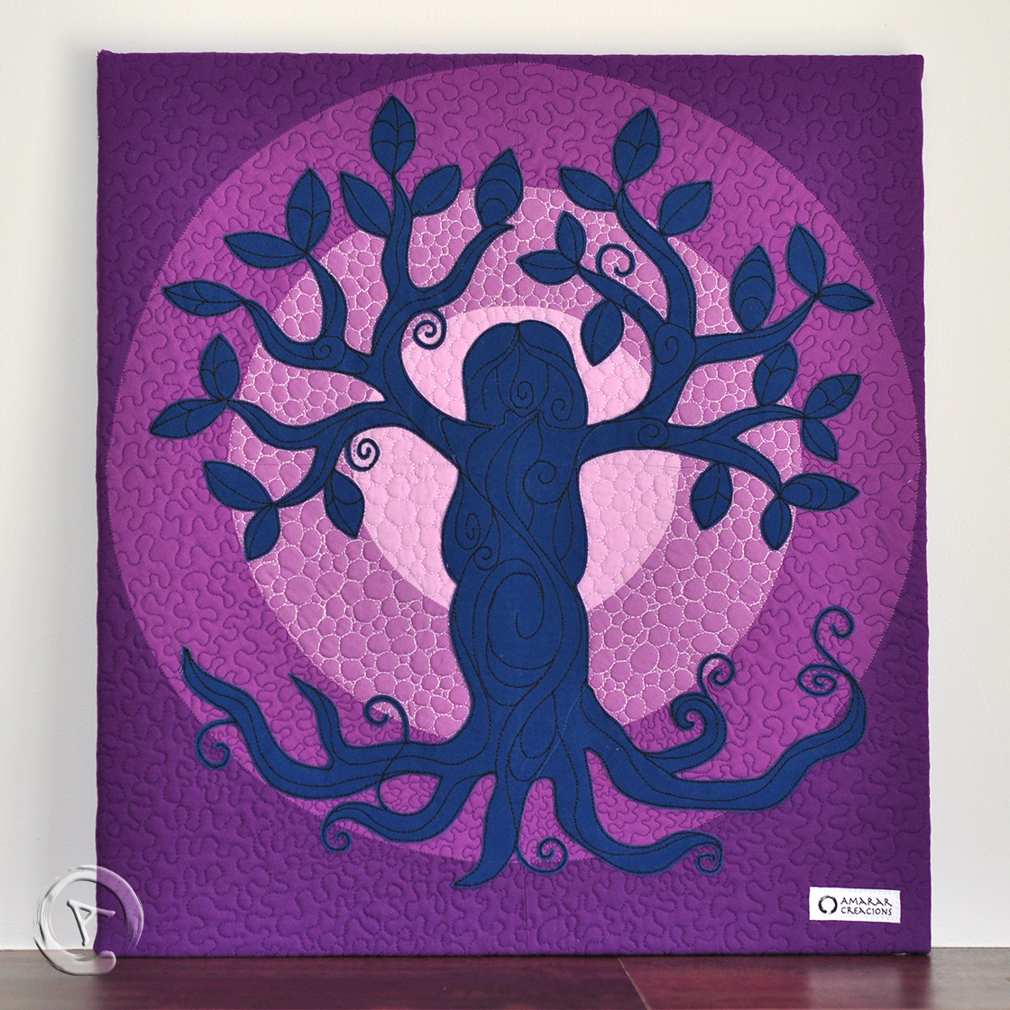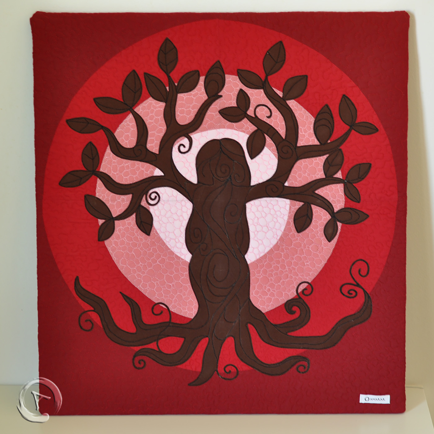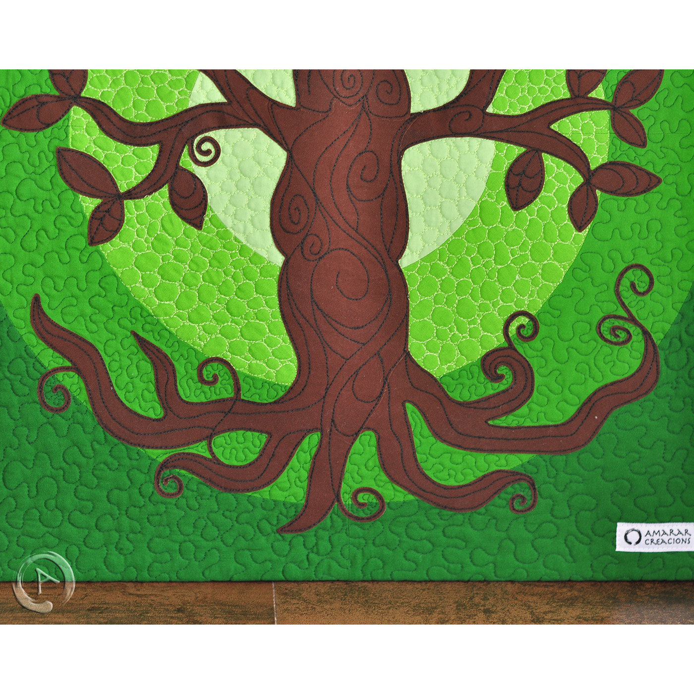 I designed this art quilt when I was pregnant of my fist daugther. At this moment, in my mind there was a lot of ideas about the life, ours roots, the connections between these roots and the growing of my daugther, the streght of she was giving me and I to her,… and I put all of this thoughts in a tree of life. The gradient background means for me the light and the hope of a new life.