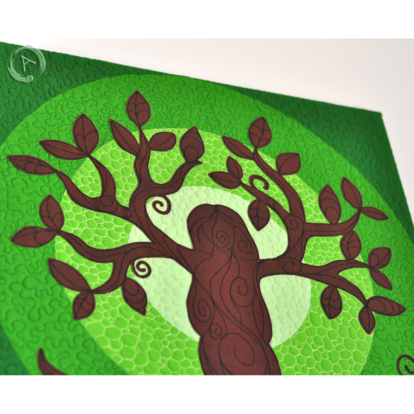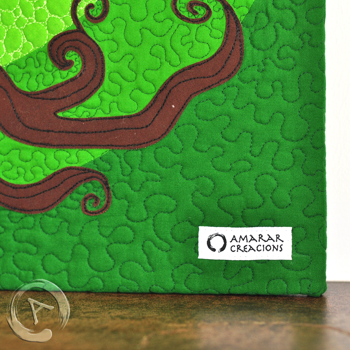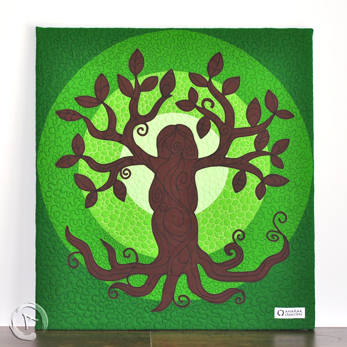 This quilt is handmade by me at home pieced and quilted in my sewing machine. At fist I piece the backgroud in 4 differents tones of a color. Then I cut the tree and sew it over the backgroud. The tree is embroidered with a lot of curves and spirals to inspire a woman. Finally I quilt it, two colors with pebbles and two colors with stippling. This quilt can be put on a wood frame or board, or binded with a sleeve for hanging. I can sent it to you without the frame neither the bind, so you can put it on a frame yourself.