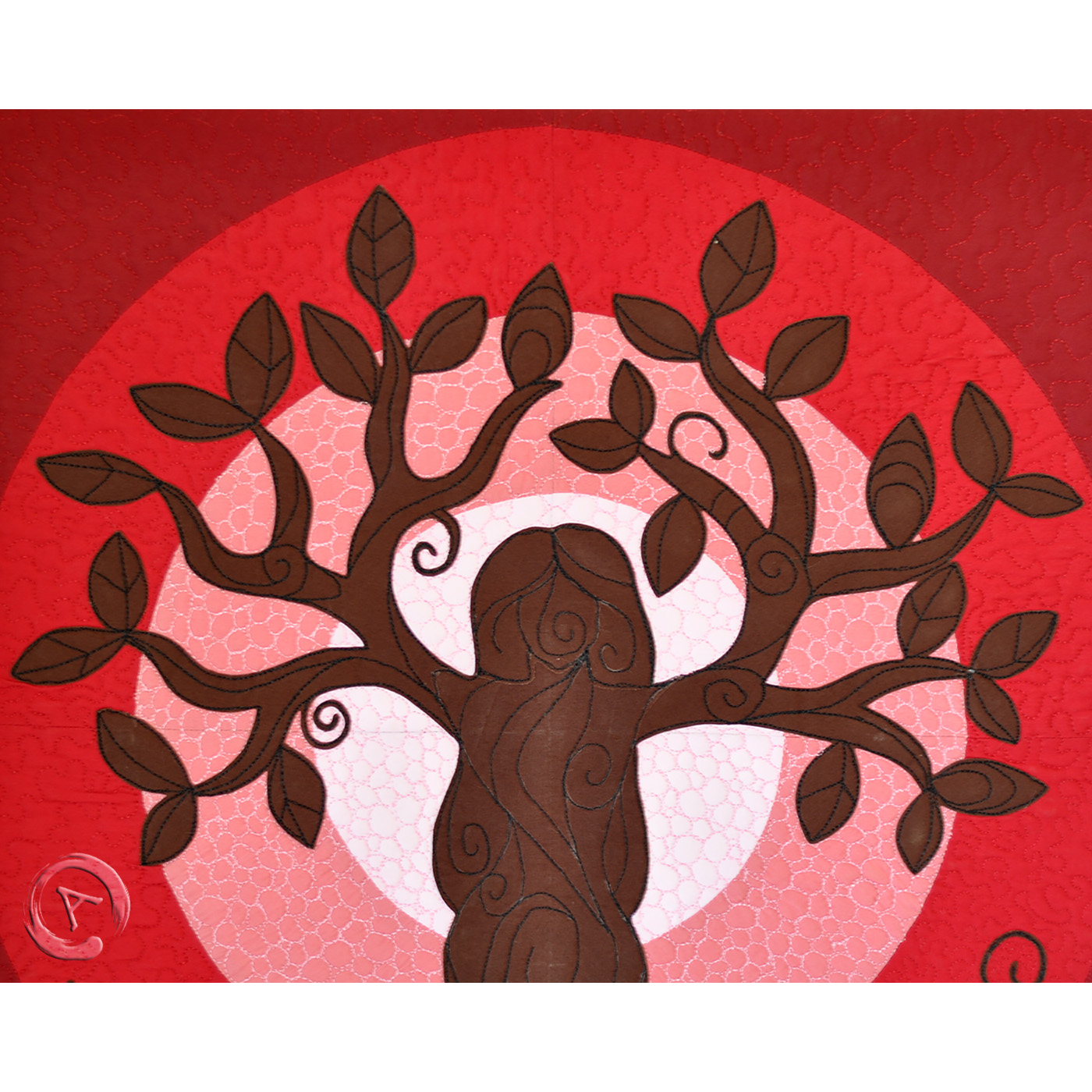 This is an art quilt to hang in a wall which represents a tree of life over an concentric circles scale of colors background.
