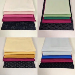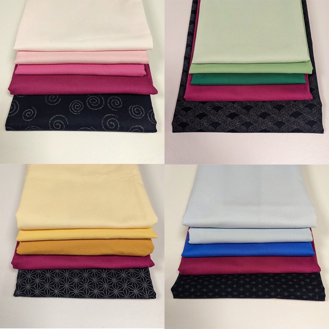 I decided to make every one of the seasons with one of those Japanese fabrics for the background and one colour with its gradations for the shapes. So, for the Spring I picked pinks (Baby pink, Pearl Pink and Dragon Fruit) with the spiral background, reminding me of the wind in the spring that makes go down all the petals. For the Summer, the greens (Mint, Holly Green and Aspargus) with the seigaiha motif like if there were sea waves all around. For the Autumn I chose the yellows (Butter, Daffodil and Gold) plus the asanoha Japanese fabrics, and for the Winter, the blue fabrics (Blueprint, Blue and Sky) plus the background fabric with little spots that remind us of the falling snow.