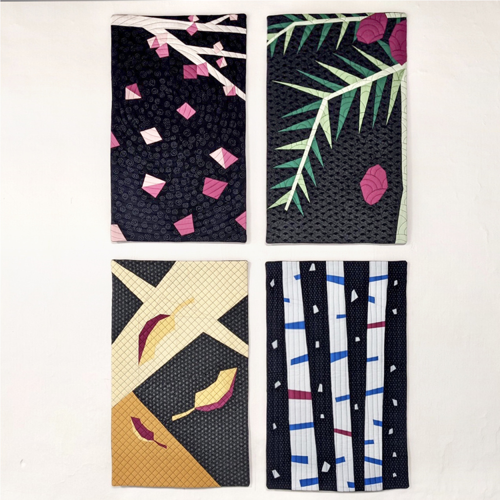 They are quilted matching the background motif. The Spring with a spiral, which starts in a special point (keep reading), the Summer with a Baptist Fun motif to recreate the sea waves, the Autumn with a diagonal grid to match the asanoha Japanese motif and for the Winter, vertical lines to remind us the vertical direction of the snow falling from the sky.