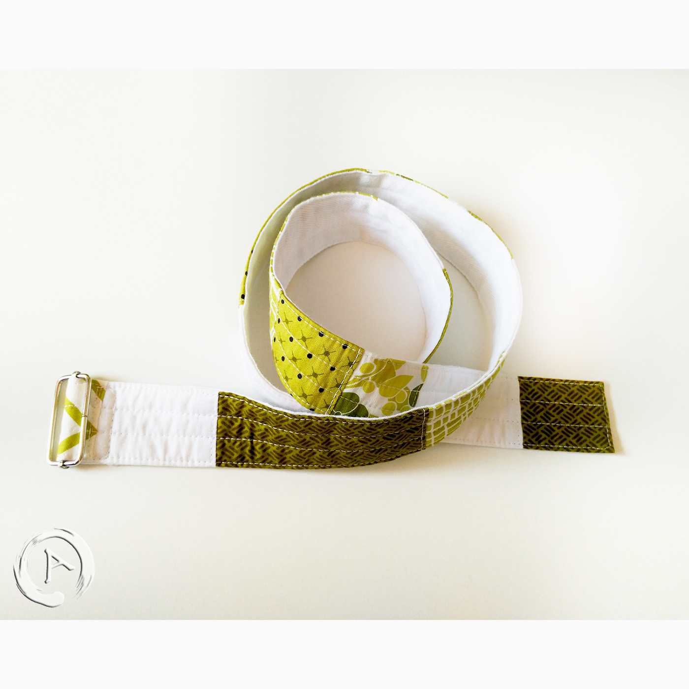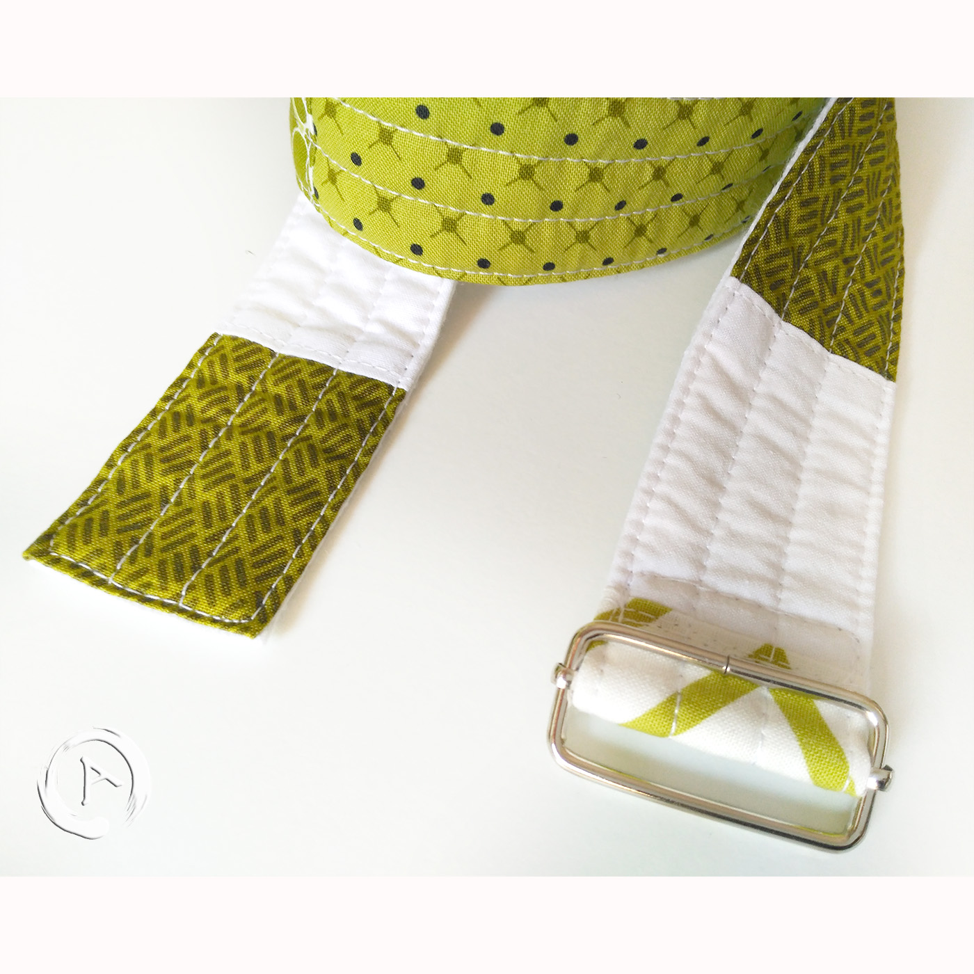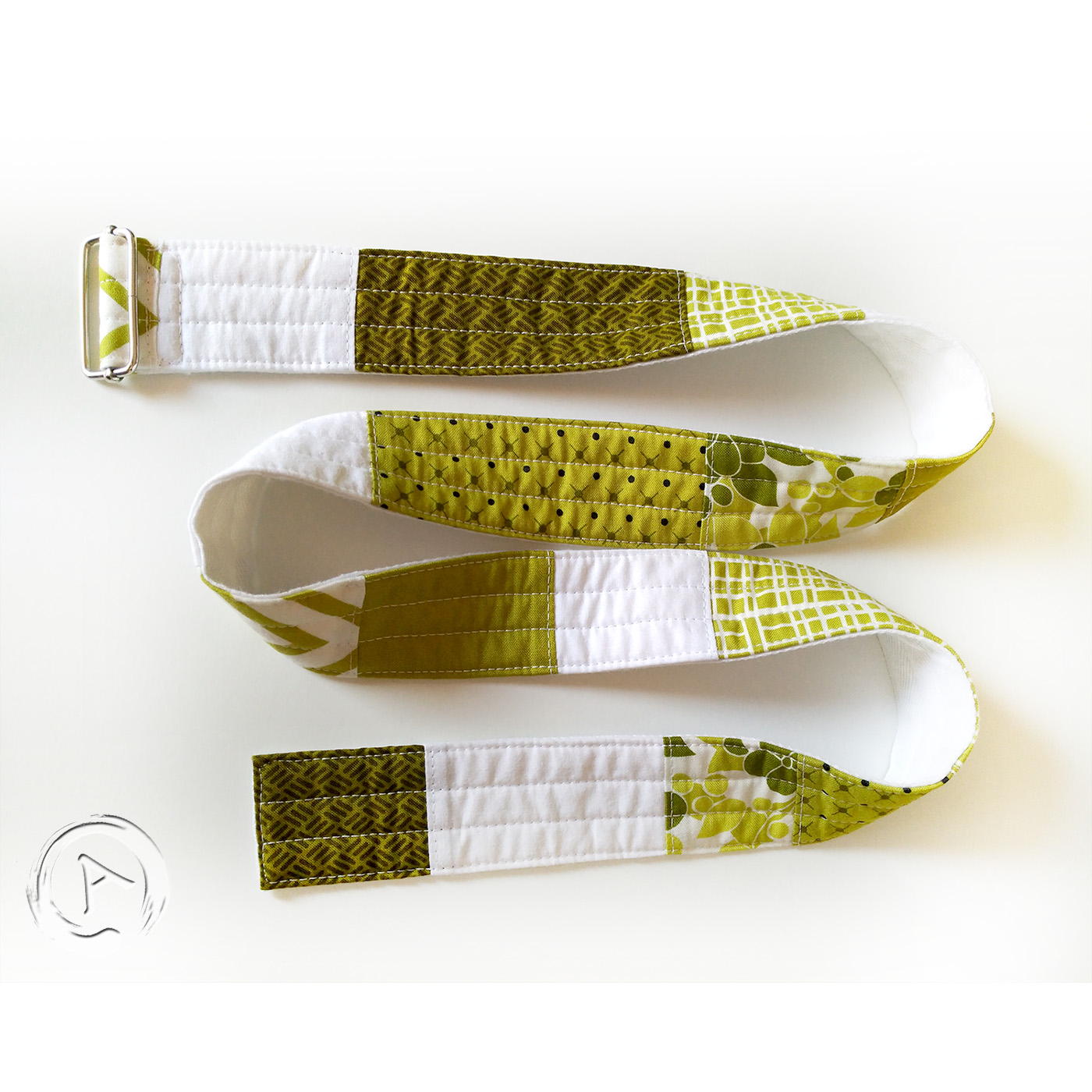 - Parte superior: Telas de algodón 100%, tonos verdes, del “Simply Colorful II Charm Pack” de la marca Moda Fabrics, y trozos blancos de tela de algodón 100%.