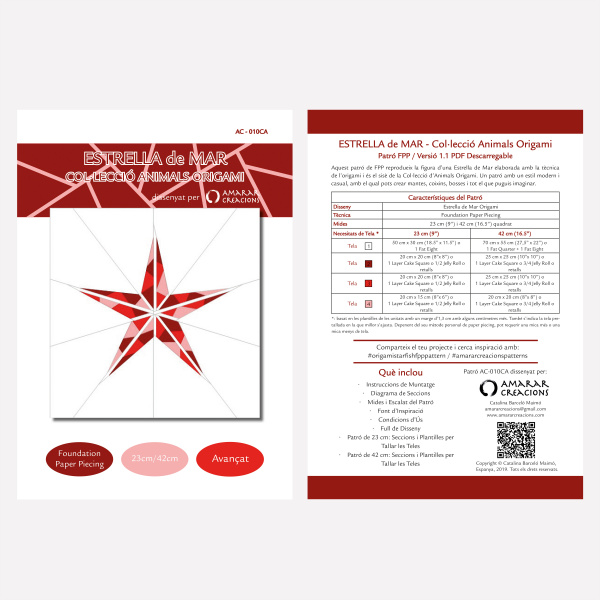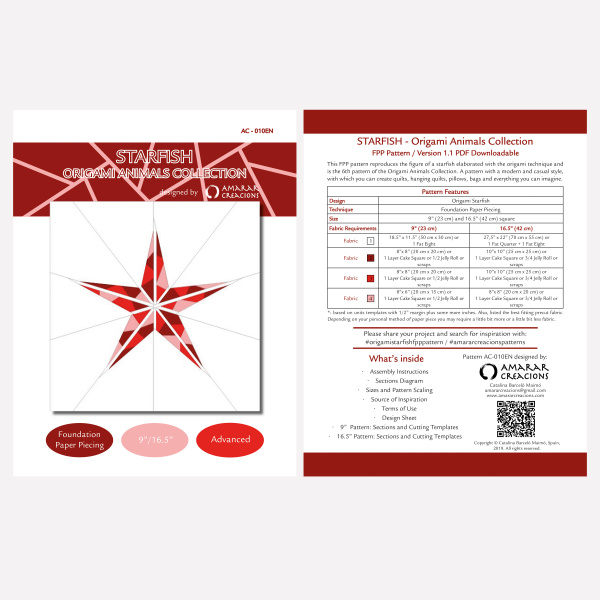 Los patrones incluyen: plantillas de las secciones para elaborar los animales de Origami en 2 tamaños (23 cm / 9 ” y 42 cm / 16.5″), instrucciones de montaje, diagrama de secciones, fórmula de escalar elpatrón y pueda hacerlo en diferentes tamaños, hoja de diseño y plantillas para cortar las telas. También incluye un nuevo sistema de versiones para que puedas descargar de forma gratuita los patrones si hay cambios o actualizaciones futuras.