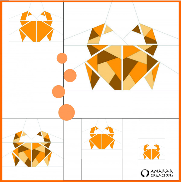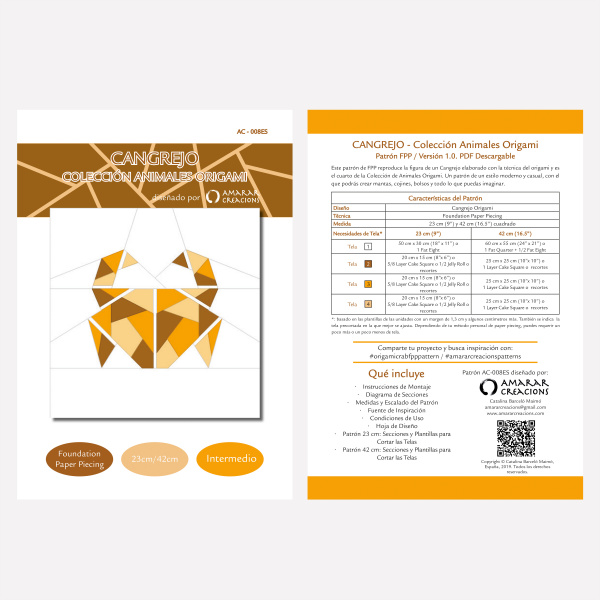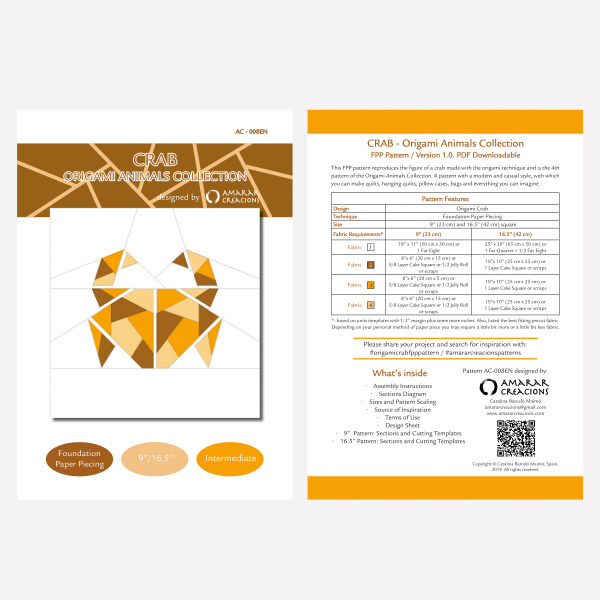 El patrón incluye: Plantillas para elaborar el Cangrejo Origami en dos tamaños 23 cm (9 “) y 42 cm (16.5”), Instrucciones de montaje, diagrama de secciones, fórmula de escalado para que se pueda elaborar en diferentes tamaños, hoja de diseño, las piezas del patrón y las plantillas para cortar las telas. También incluye un nuevo sistema de que pueda descargar de manera gratuita a los futuros cambios o actualizaciones que se hagan a este patrón.