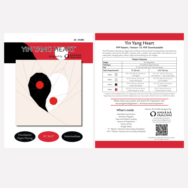 El patrón incluye: Plantillas para elaborar el Corazón Yin Yang en dos tamaños 23 cm (9 “) y 42 cm (16.5”), Instrucciones de montaje, diagrama de secciones, fórmula de escalado para que se pueda elaborar en diferentes tamaños, hoja de diseño, las piezas del patrón y las plantillas para cortar las telas. También incluye un nuevo sistema de que pueda descargar de manera gratuita a los futuros cambios o actualizaciones que se hagan a este patrón.