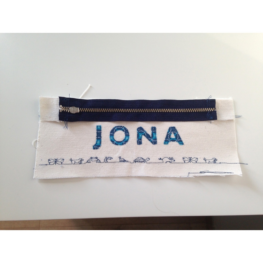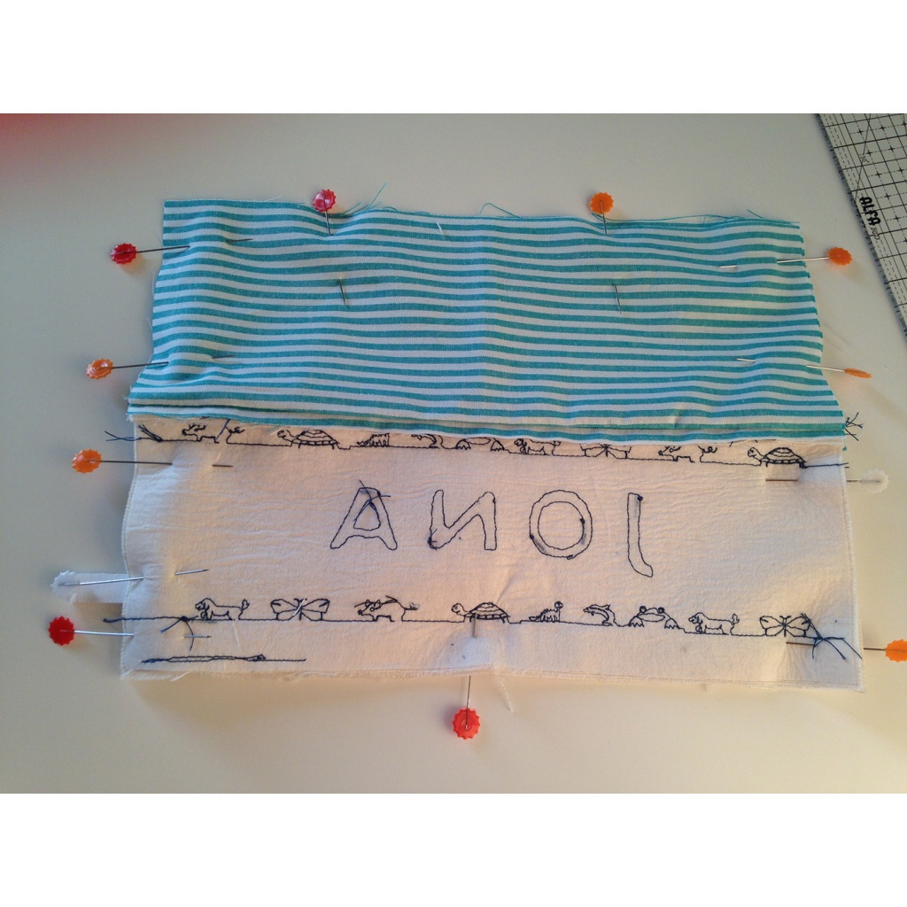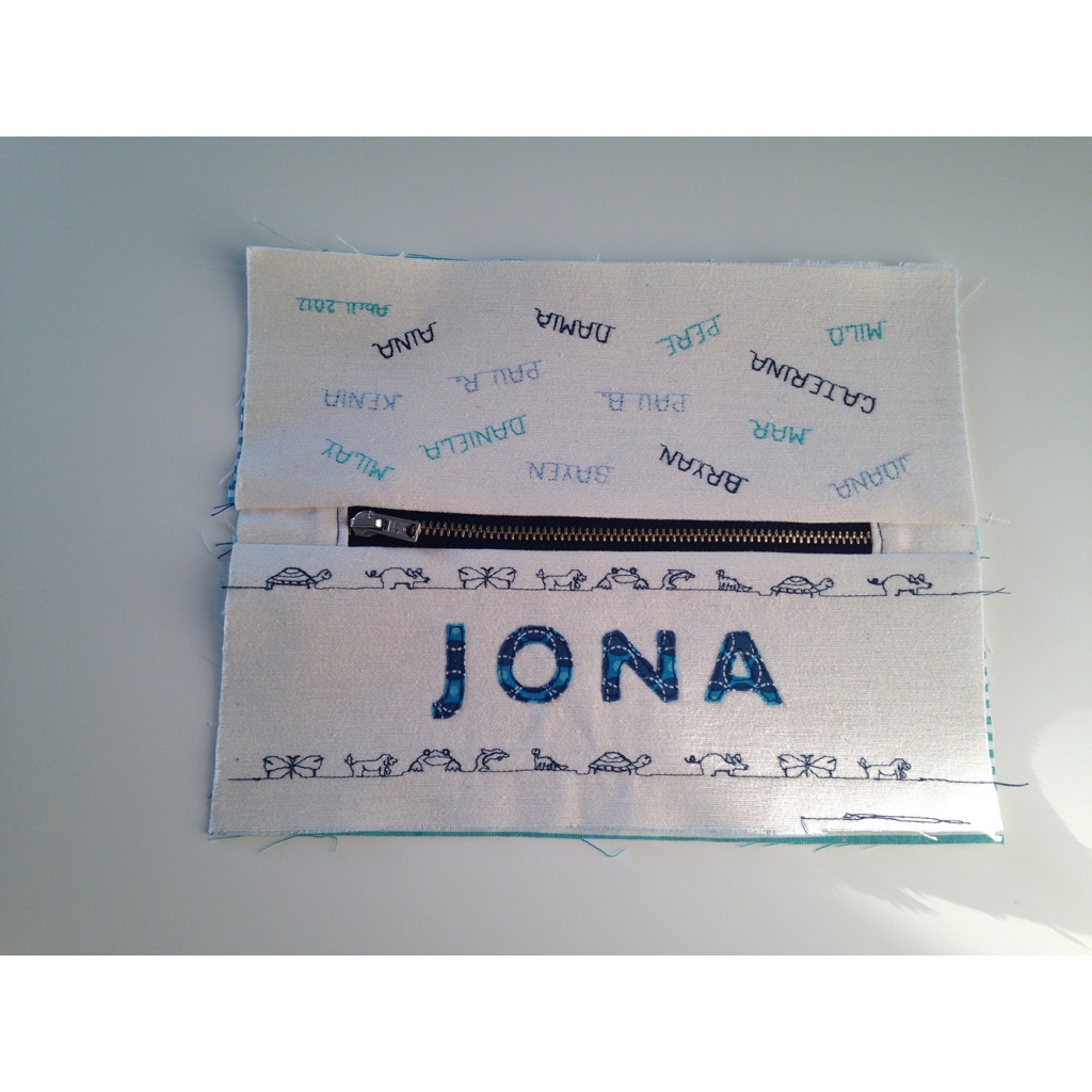 Aquí podéis ver que la parte delantera del estuche lleva un nombre y unos dibujos de animales. Para hacer este nombre he utilizado una tela de color azul con fiselina de doble cara. La he pegado a la tela del estuche con la plancha y hecho un pespunte alrededor de cada letra a 1 mm del borde. Los animales los he hecho para probar la función de diferentes bordados de dibujos que tiene mi nueva máquina de coser.