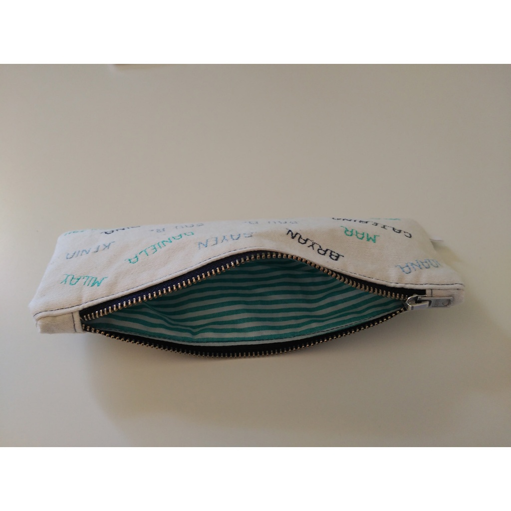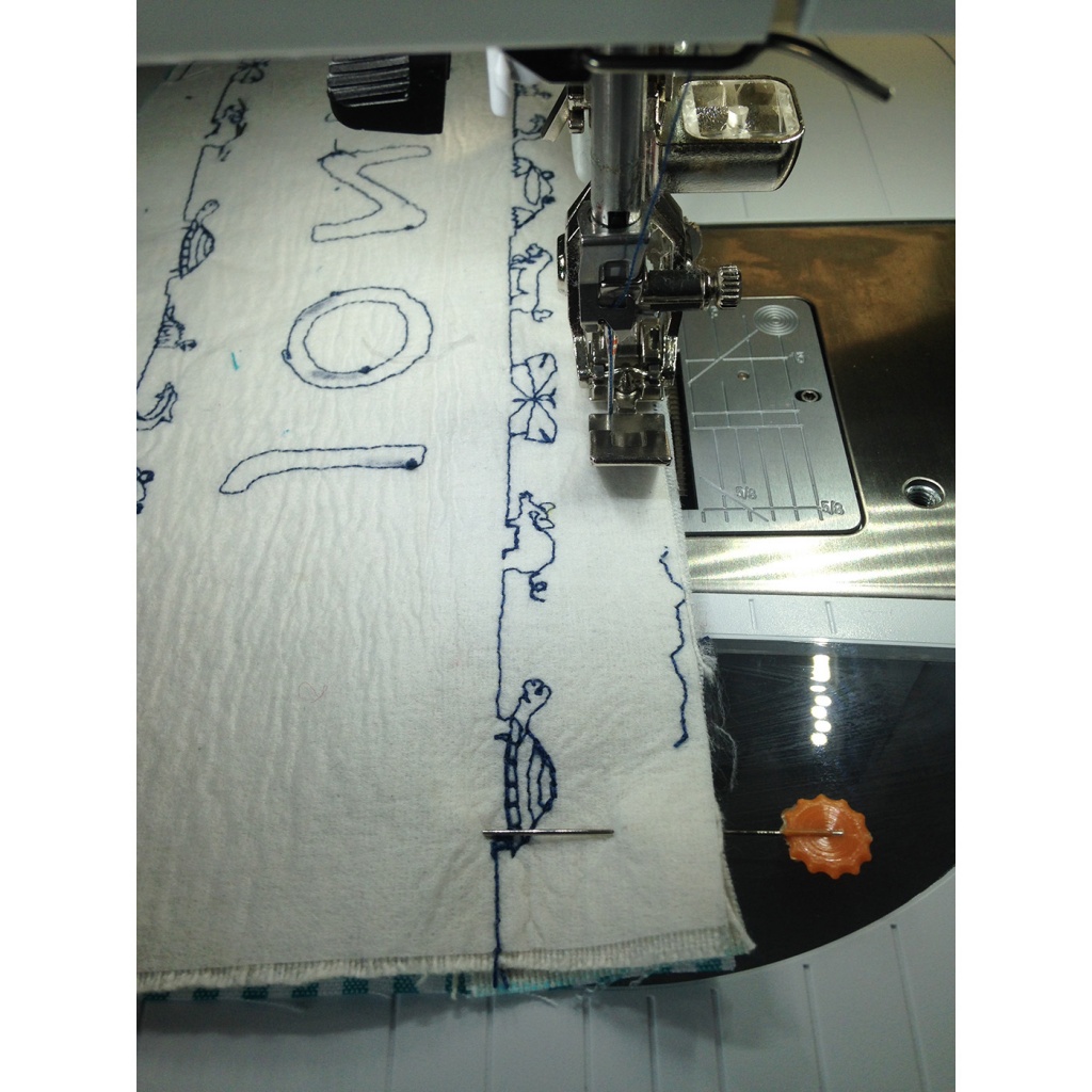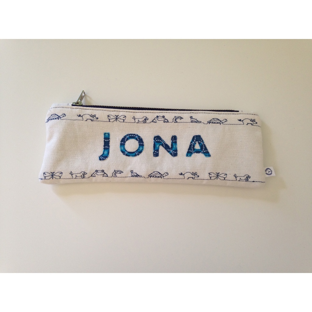 Aquí podéis ver que la parte delantera del estuche lleva un nombre y unos dibujos de animales. Para hacer este nombre he utilizado una tela de color azul con fiselina de doble cara. La he pegado a la tela del estuche con la plancha y hecho un pespunte alrededor de cada letra a 1 mm del borde. Los animales los he hecho para probar la función de diferentes bordados de dibujos que tiene mi nueva máquina de coser.