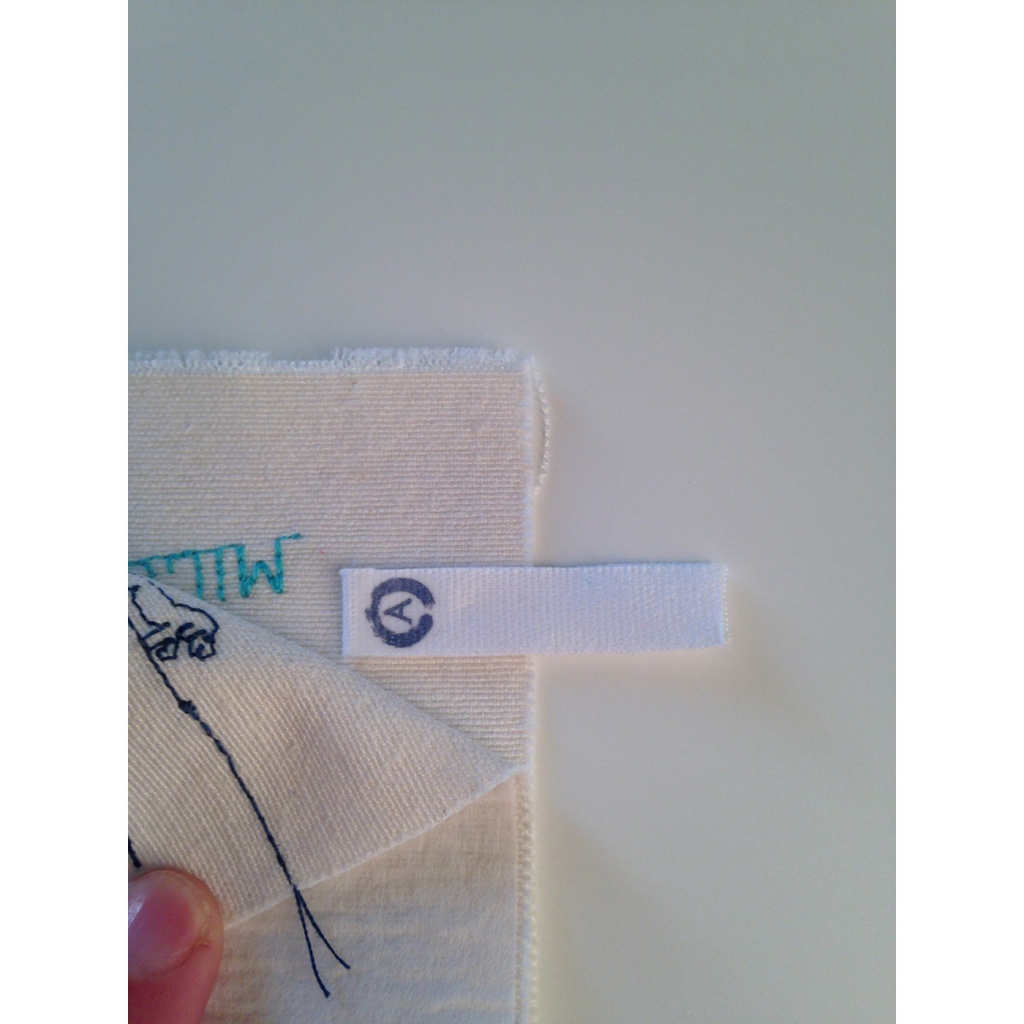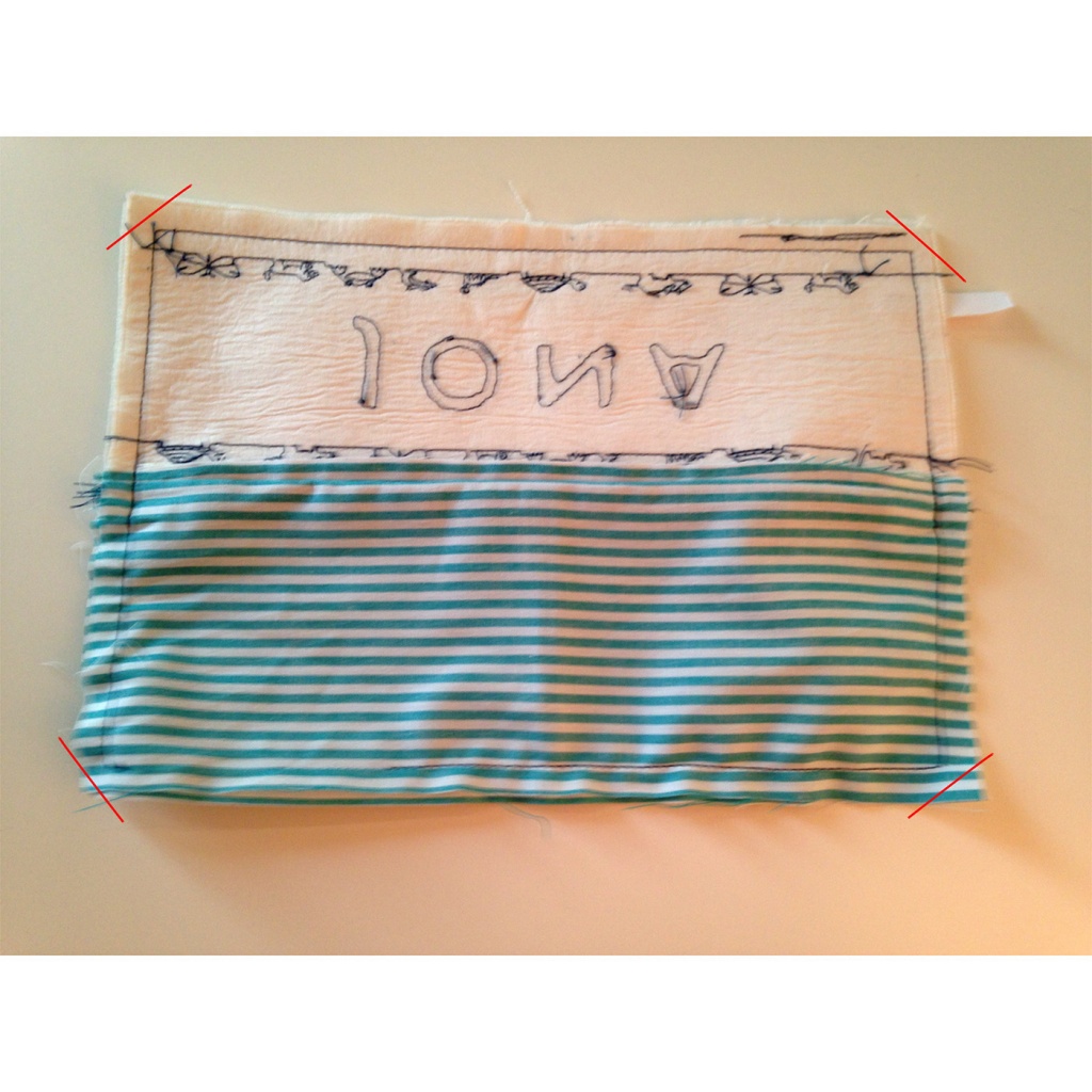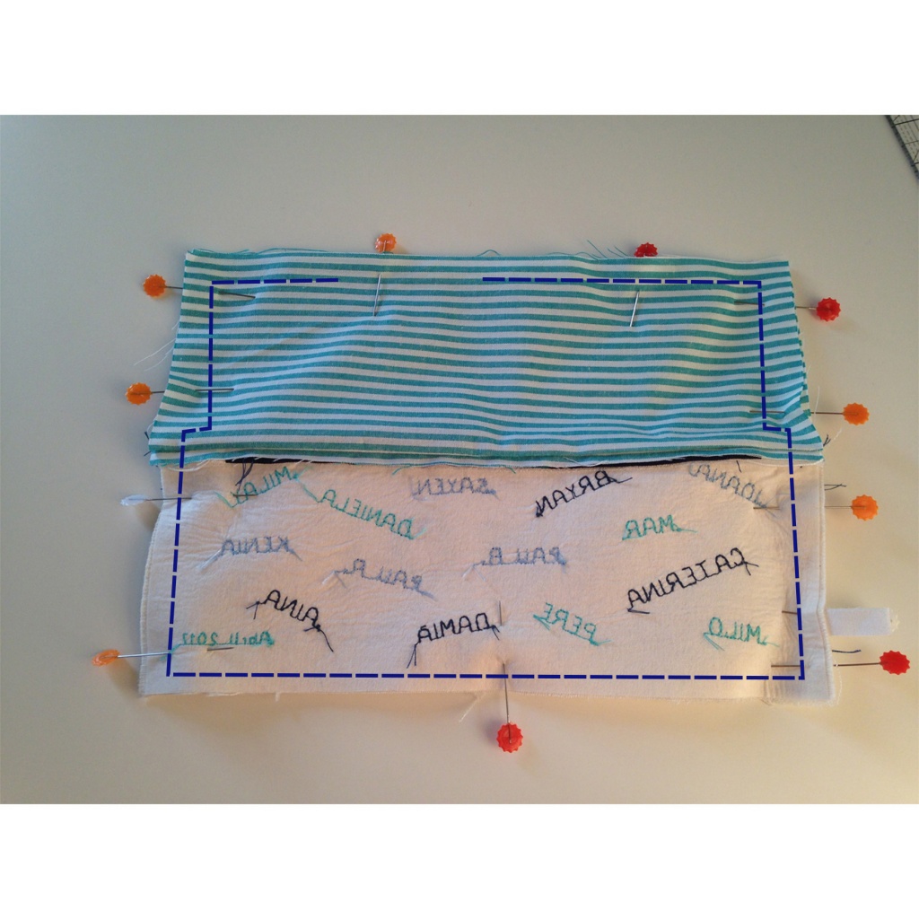 Si queremos poner una etiqueta este es el momento de colocarla en la parte interior de las telas exteriores, con el dibujo hacia delante dejando que entre un buen trozo para asegurarnos de que quede cisida con el pespunte que haremos y no pisemos el dibujo.