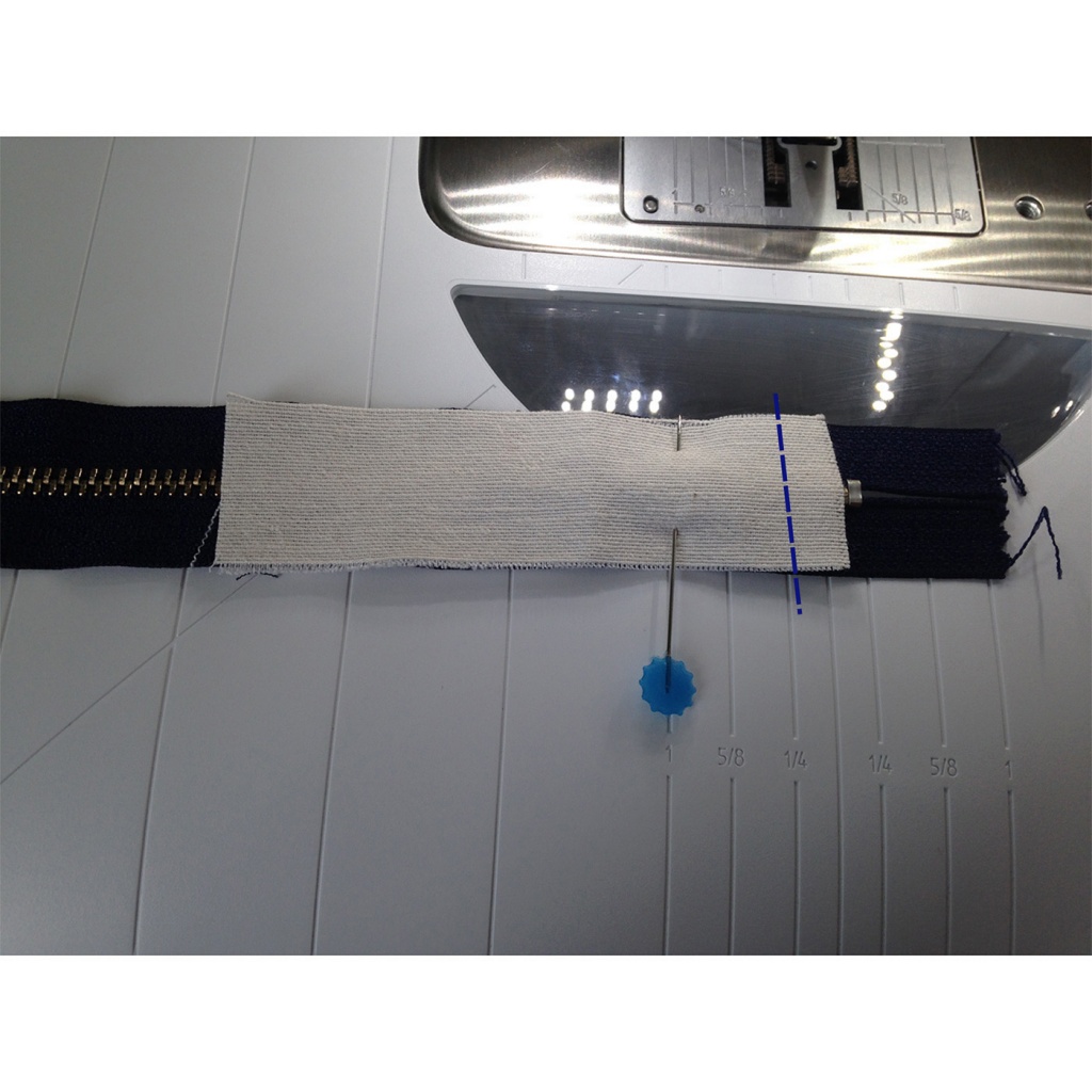 Hacemos un pespunte lo más cerca posible de la cremallera utilizando el presateles específico para poner cremalleras. Cuando nos acercamos al carro de la cremallera nos paramos, bajamos aguja, levantamos el prensateles y lo hacemos corre hacia la parte que ya hemos cosido para que no nos moleste cuando acabemos de coser la cremallera.