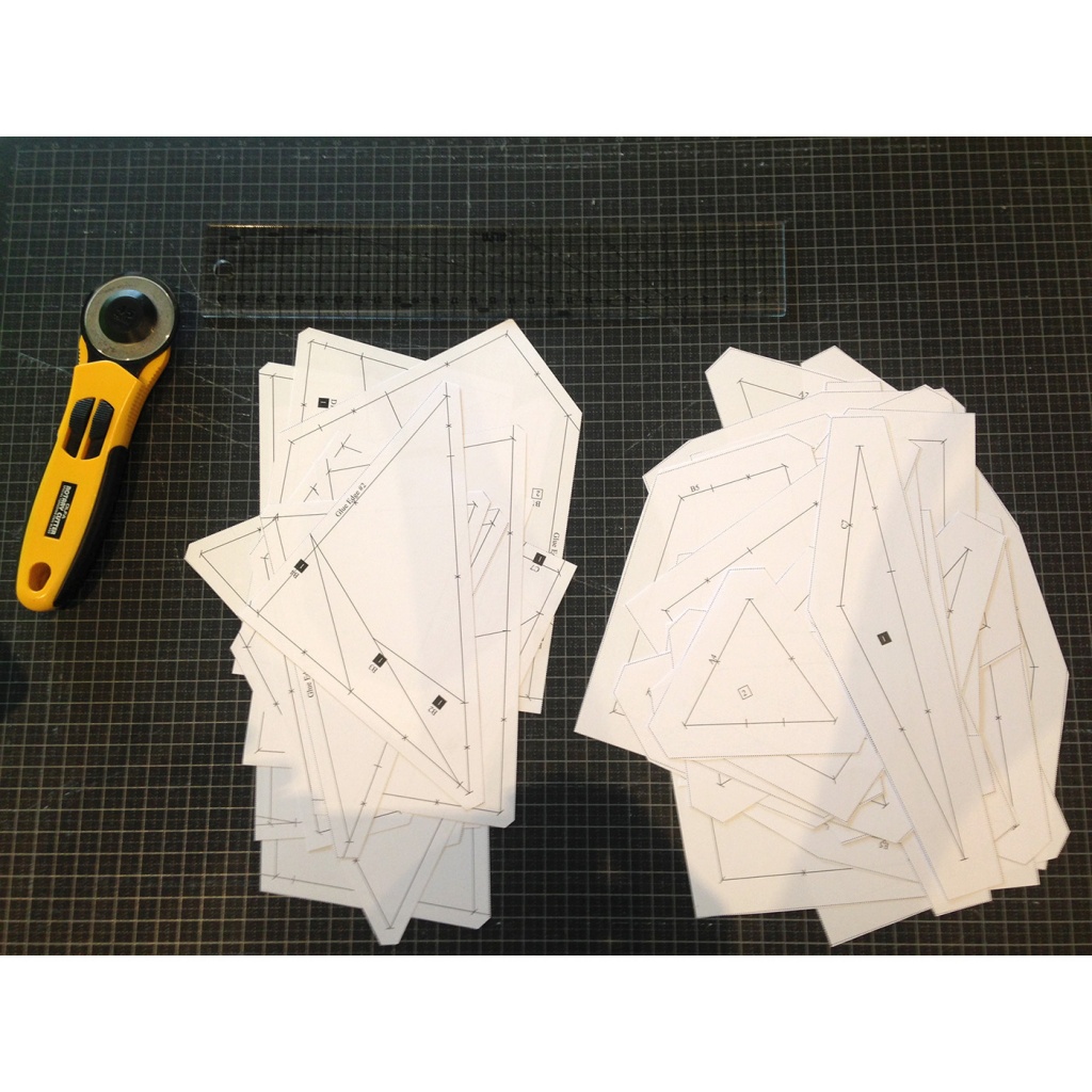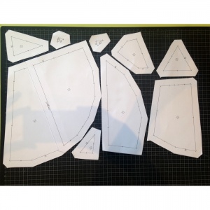 Ya comprobado esto, imprime y recorta las piezas del patrón (izquierda de la imagen) para montar las secciones y las plantillas para cortar las telas (derecha de la imagen).