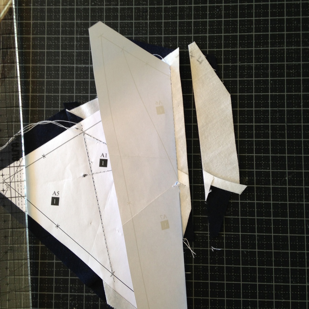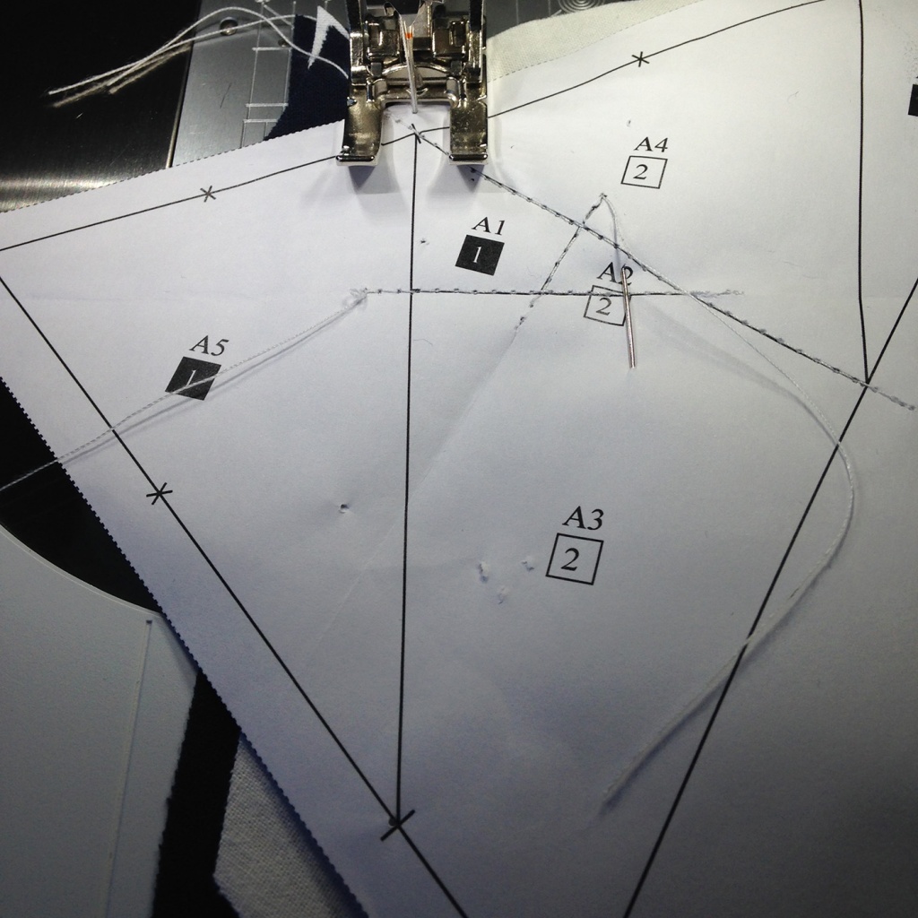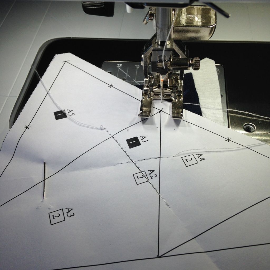 • Hacemos una costura al papel sobre la línea que une A5 y A1-A3 y con las telas en la parte inferior.