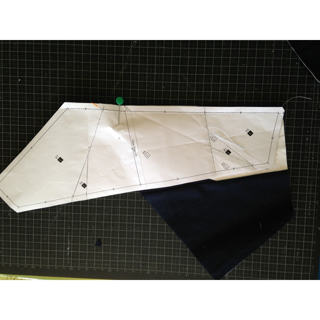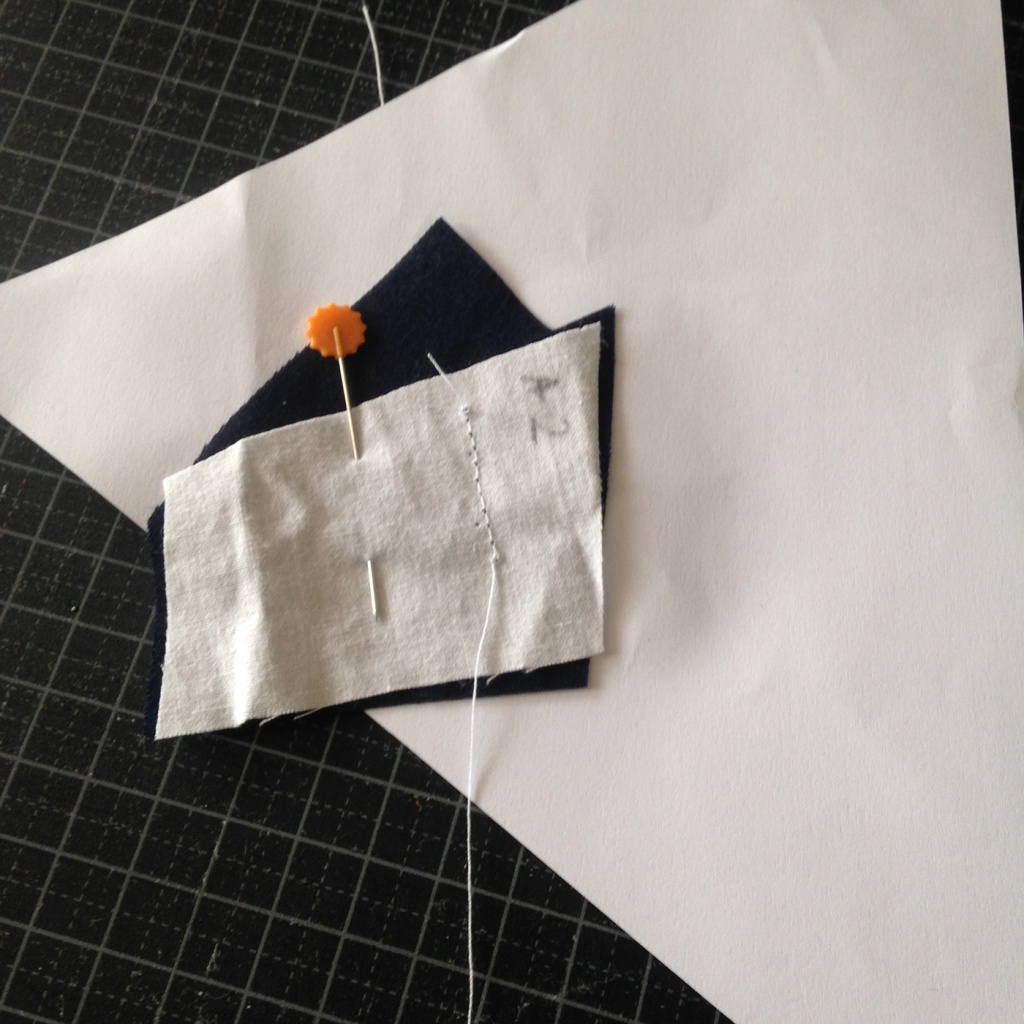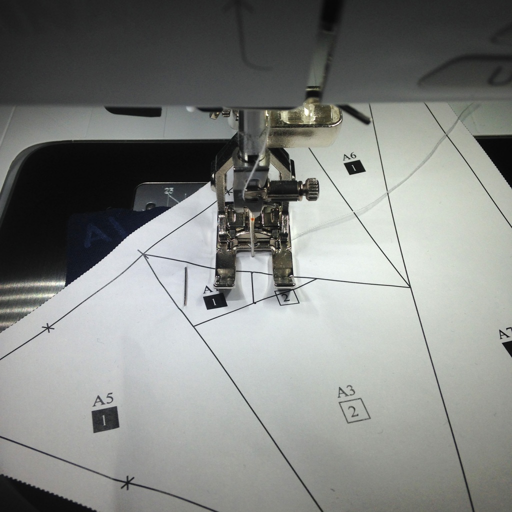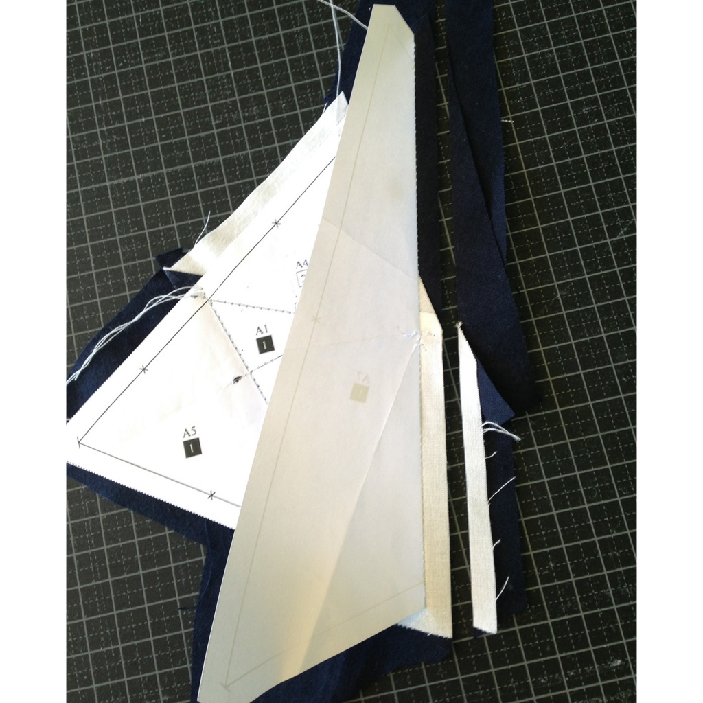 • Hacemos una costura al papel sobre la línea que une A5 y A1-A3 y con las telas en la parte inferior.