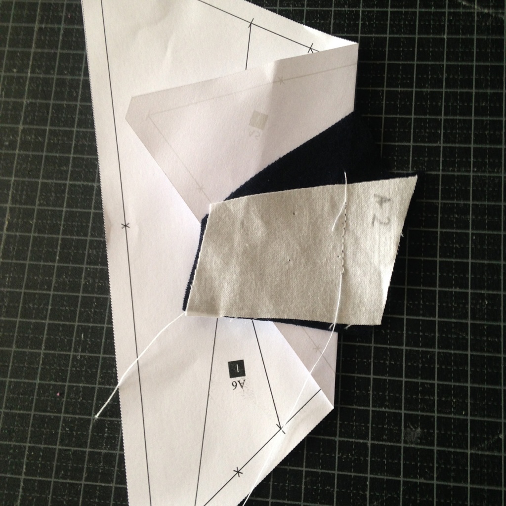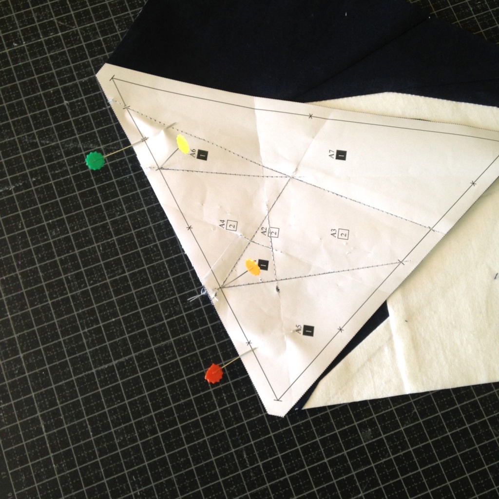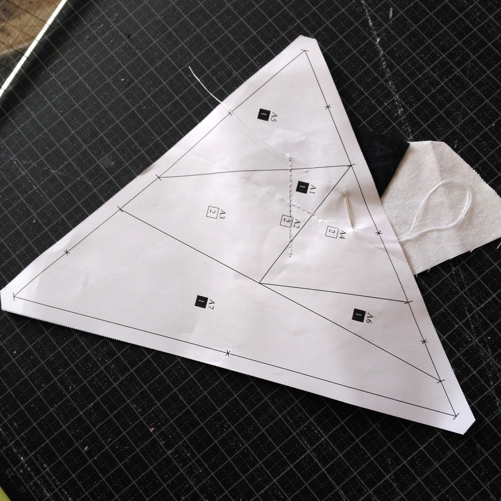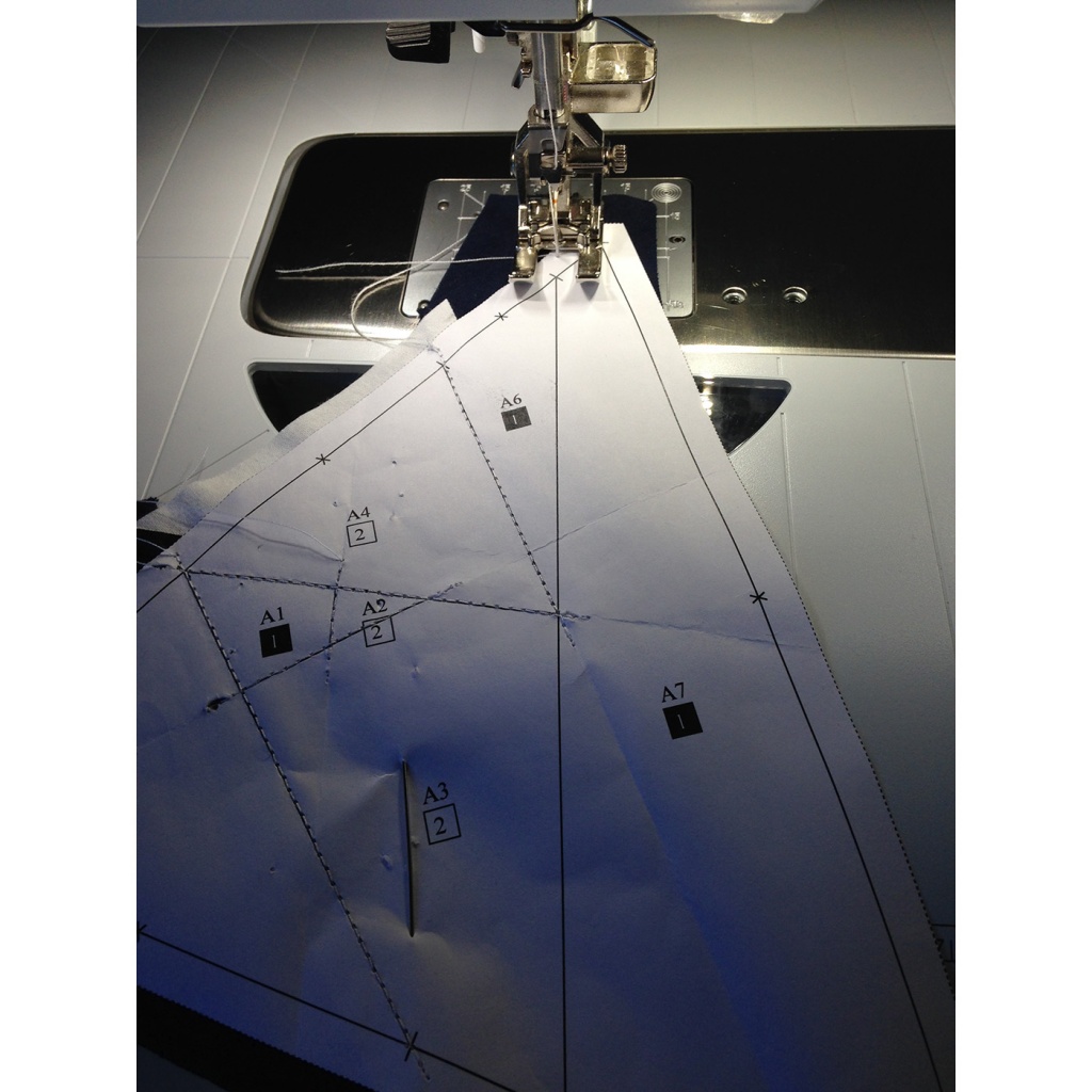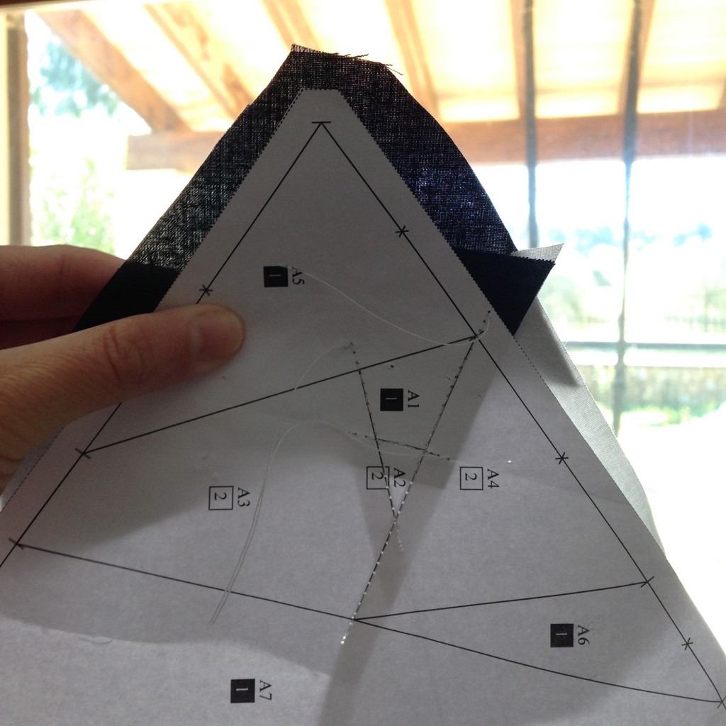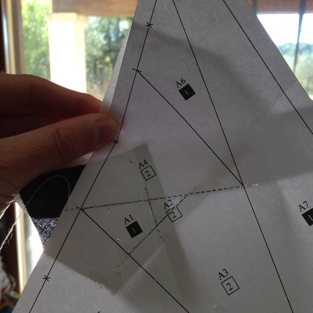 • Hacemos una costura en el papel sobre la línea que une A7 y A3-A6 y con las telas en la parte inferior.