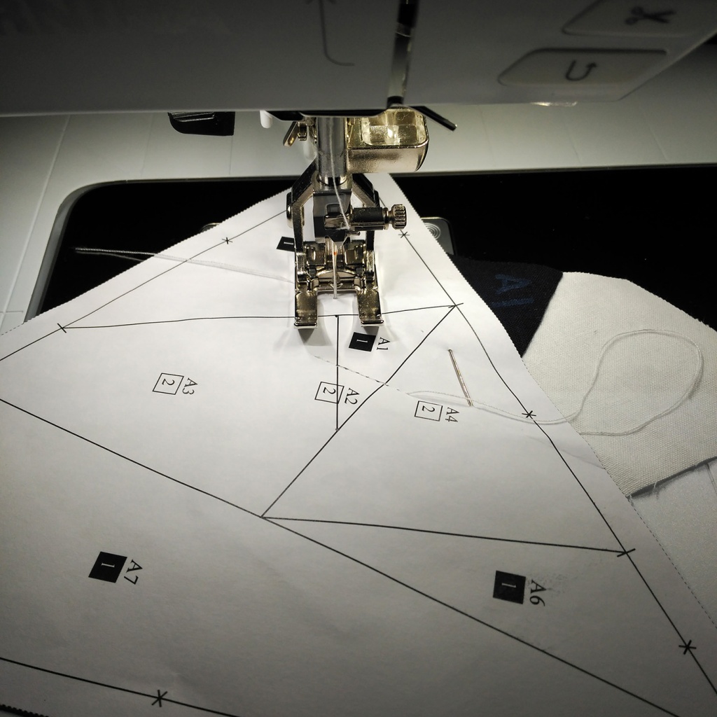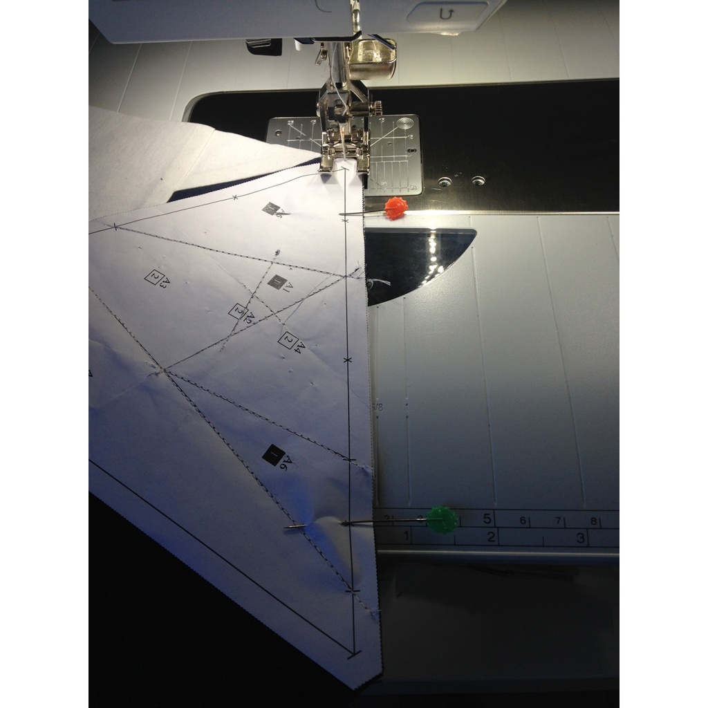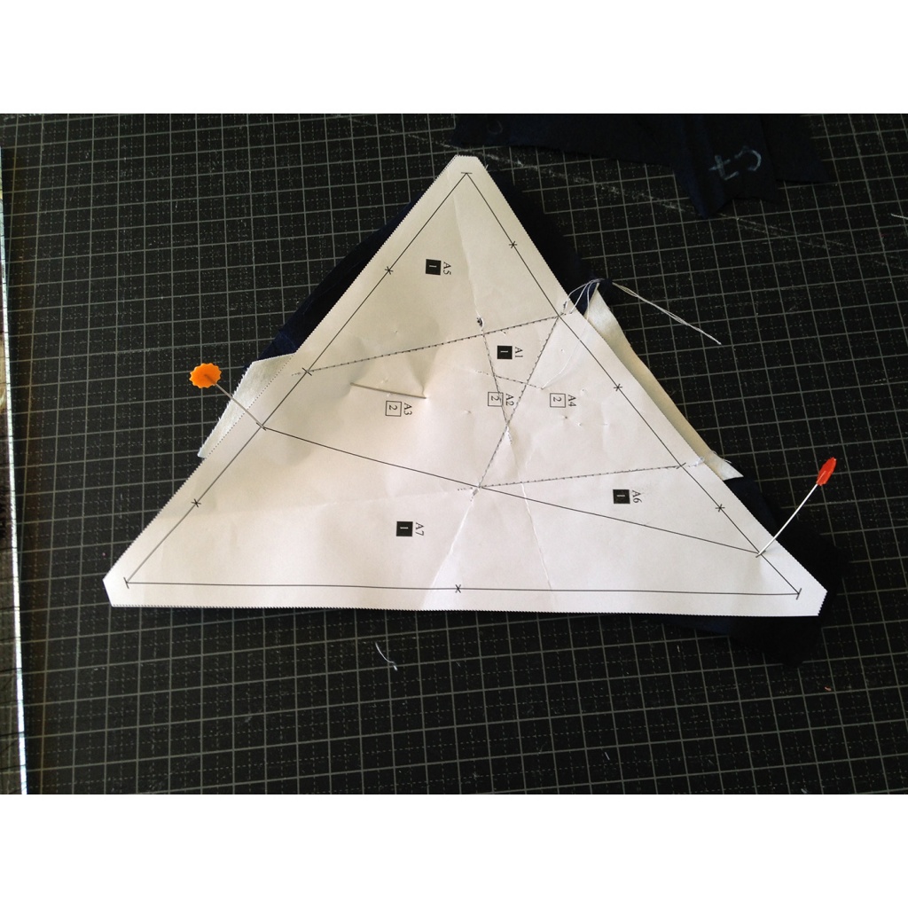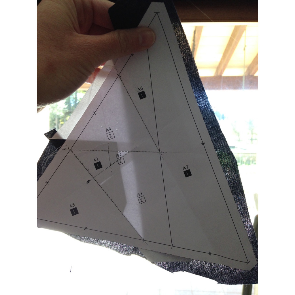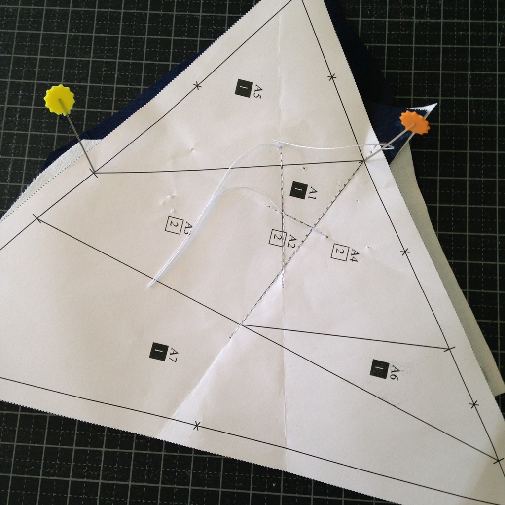 • Hacemos una costura en el papel sobre la línea que une A7 y A3-A6 y con las telas en la parte inferior.