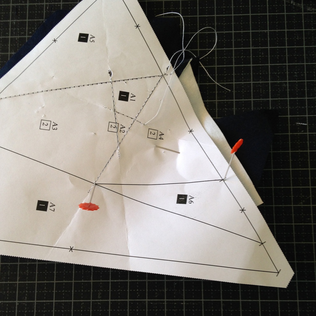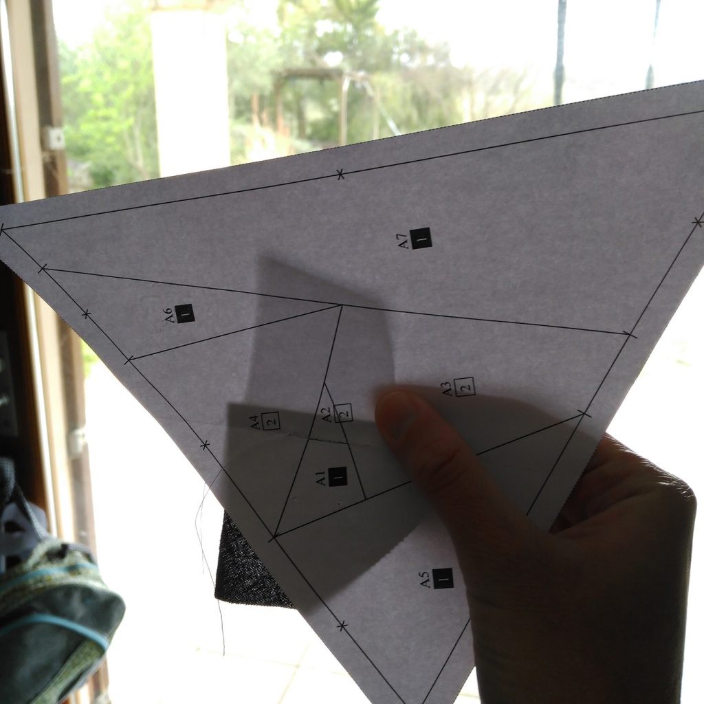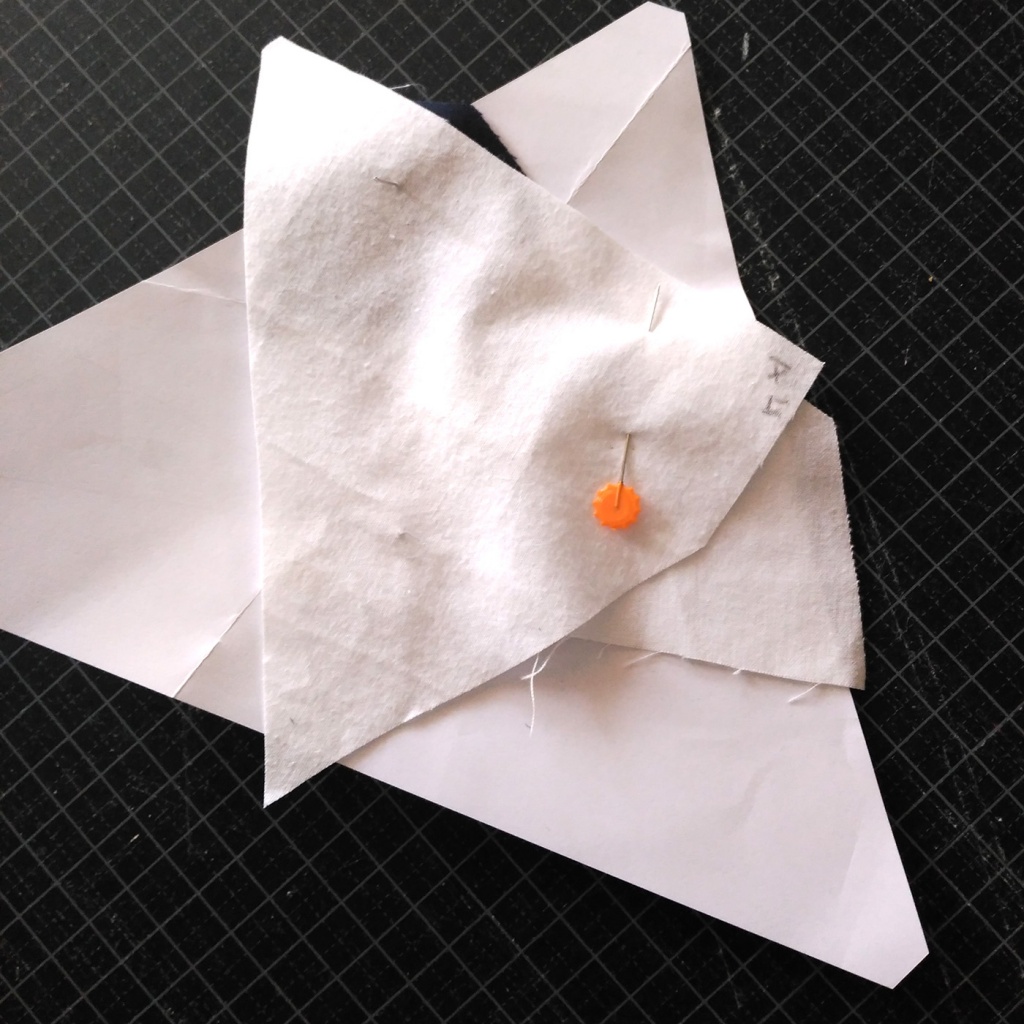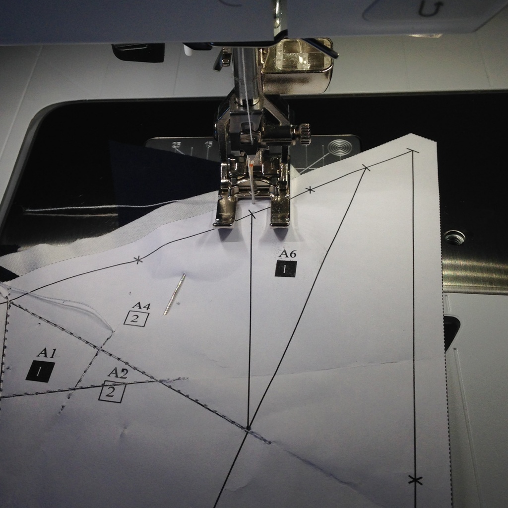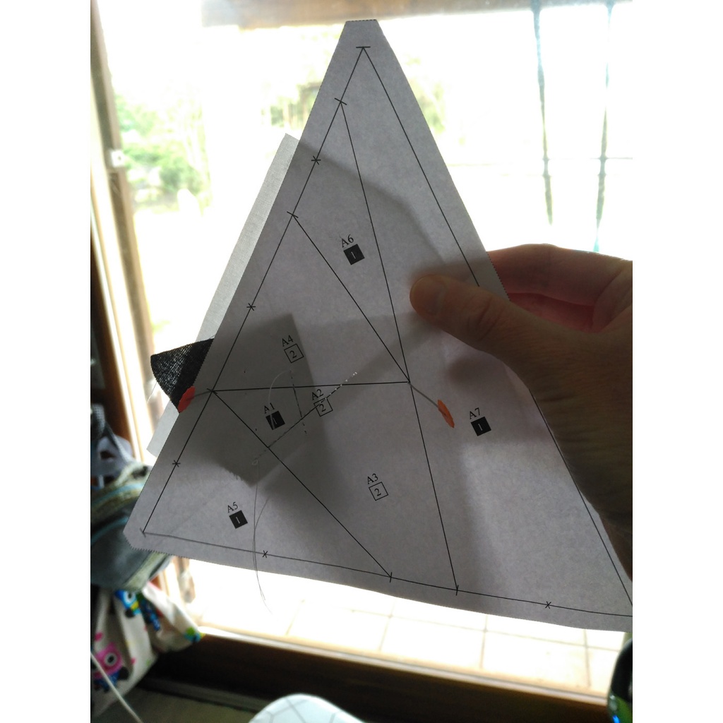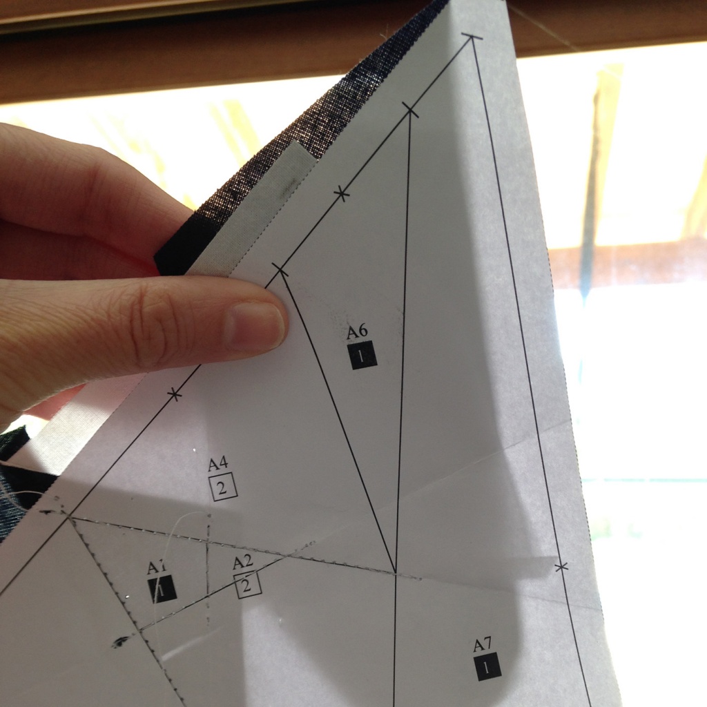 • Hacemos una costura en el papel sobre la línea que une A7 y A3-A6 y con las telas en la parte inferior.
