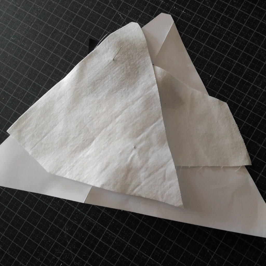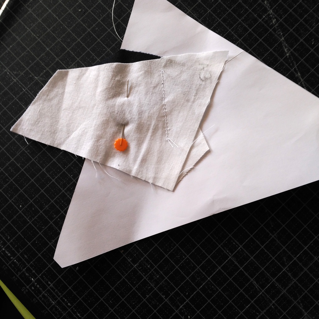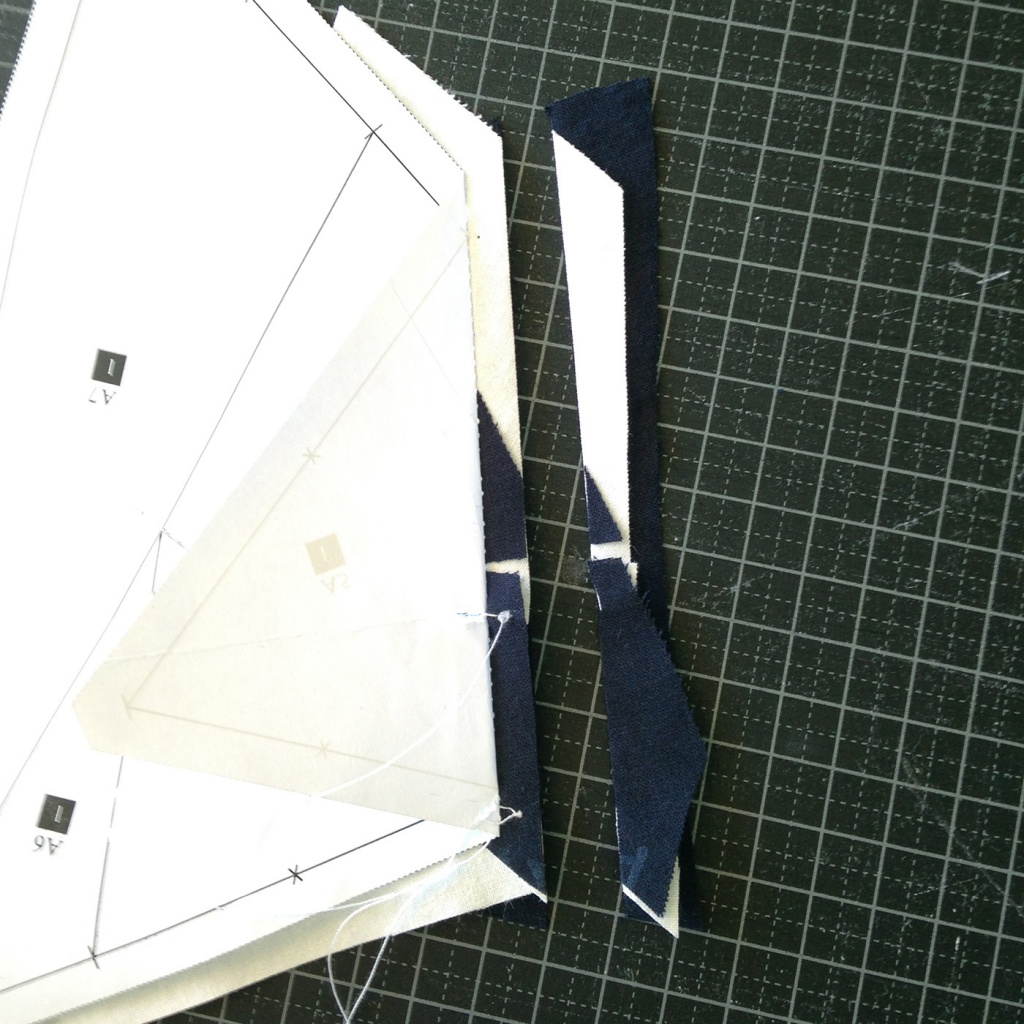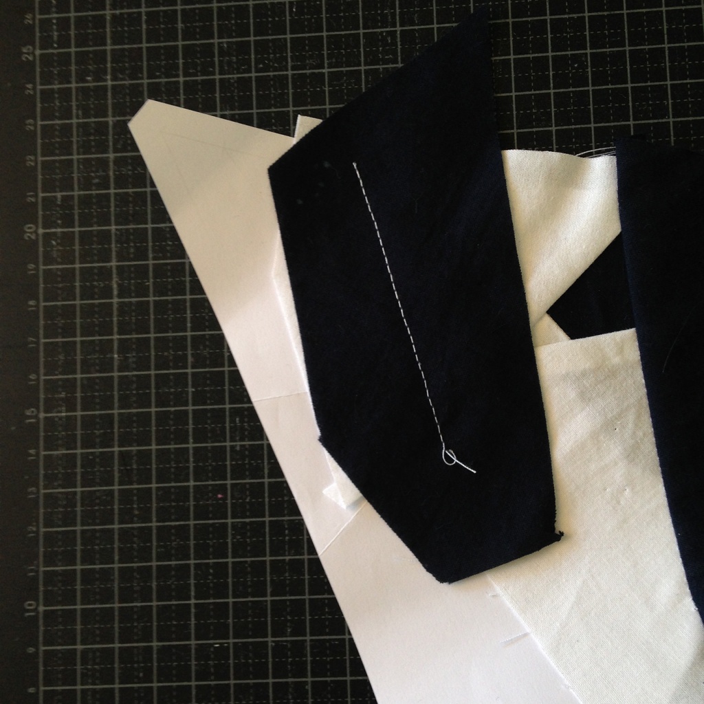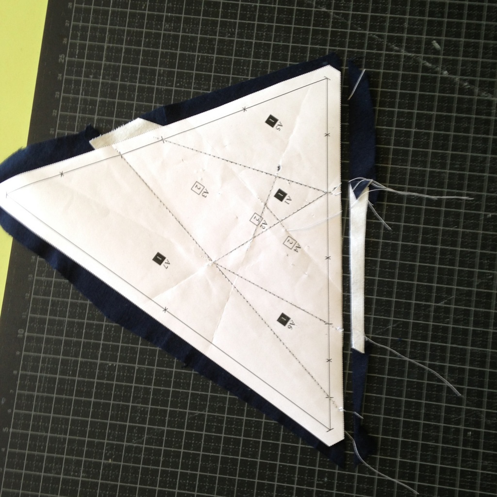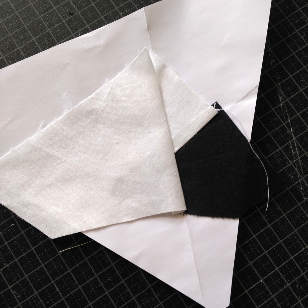 • Hacemos una costura en el papel sobre la línea que une A7 y A3-A6 y con las telas en la parte inferior.