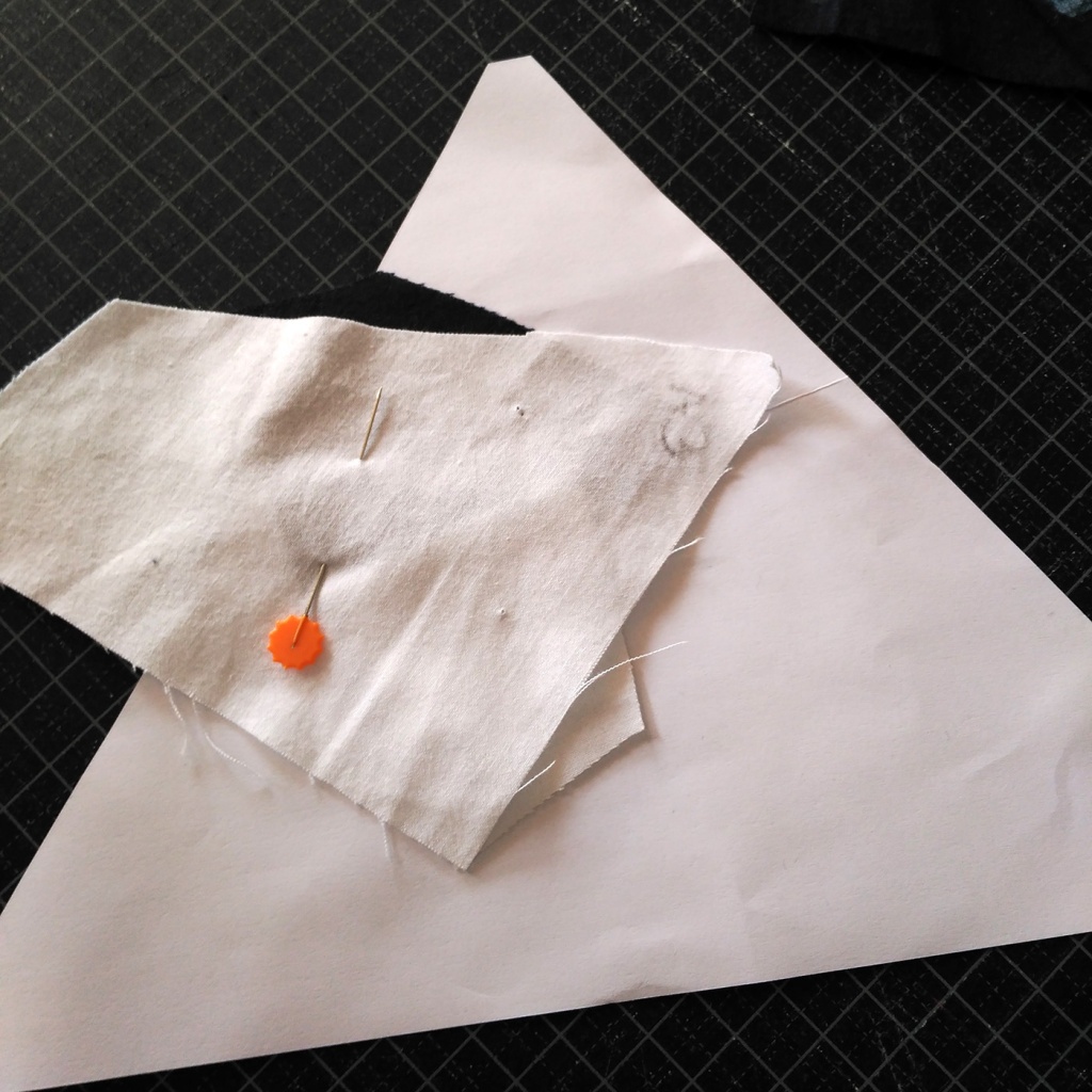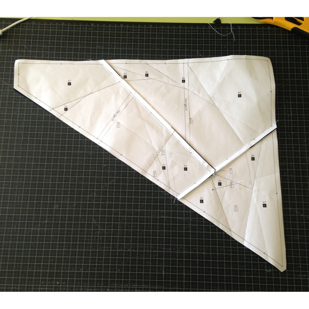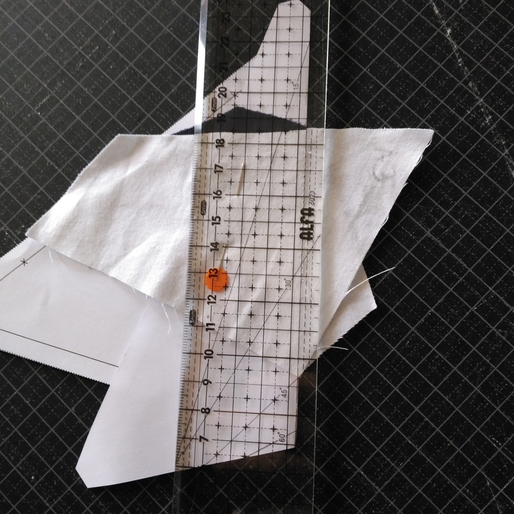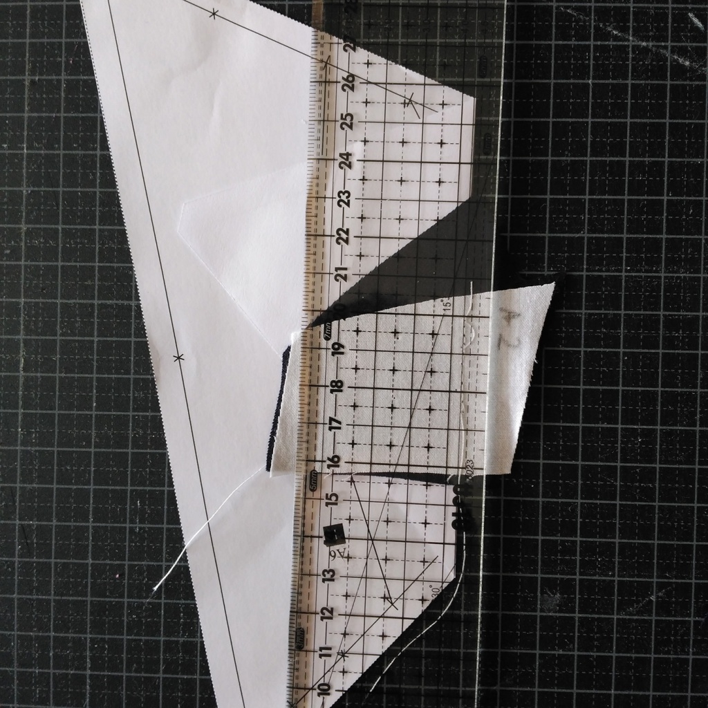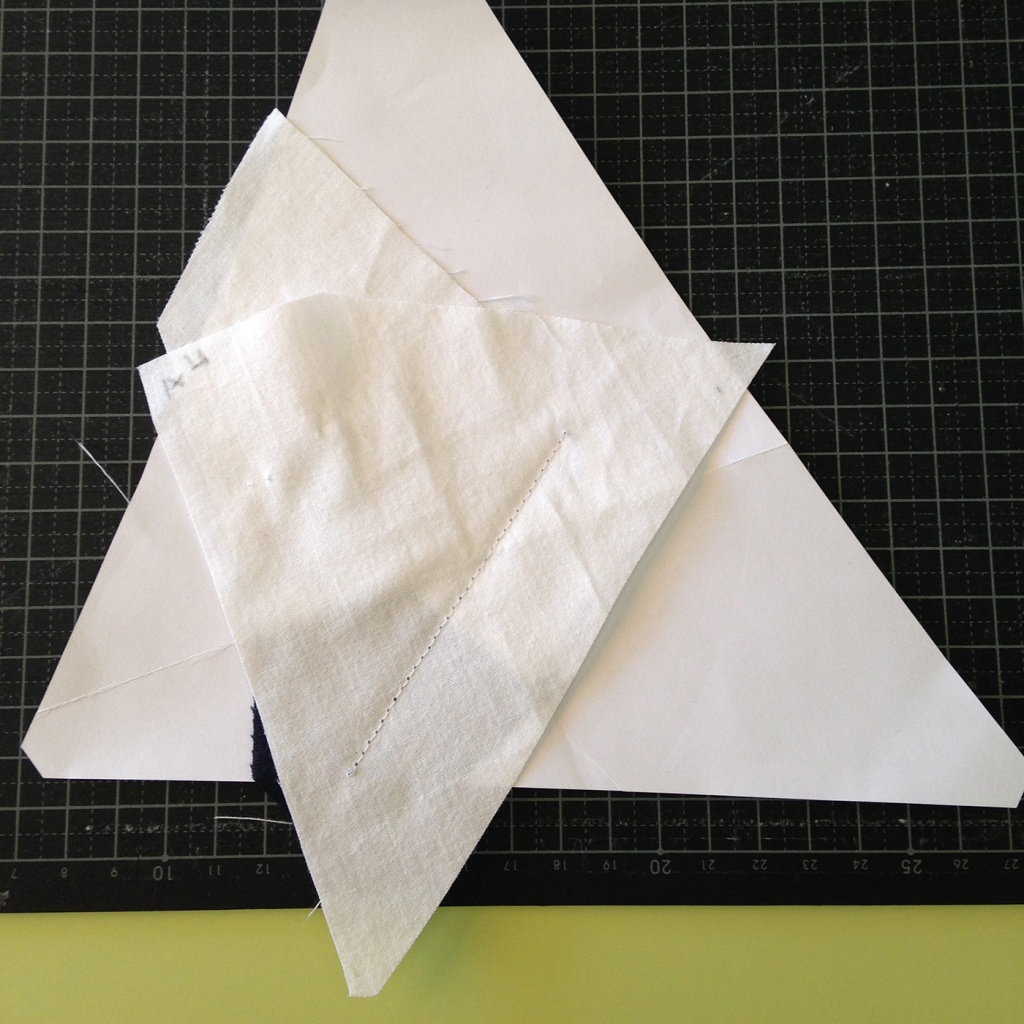 • Hacemos una costura en el papel sobre la línea que une A7 y A3-A6 y con las telas en la parte inferior.