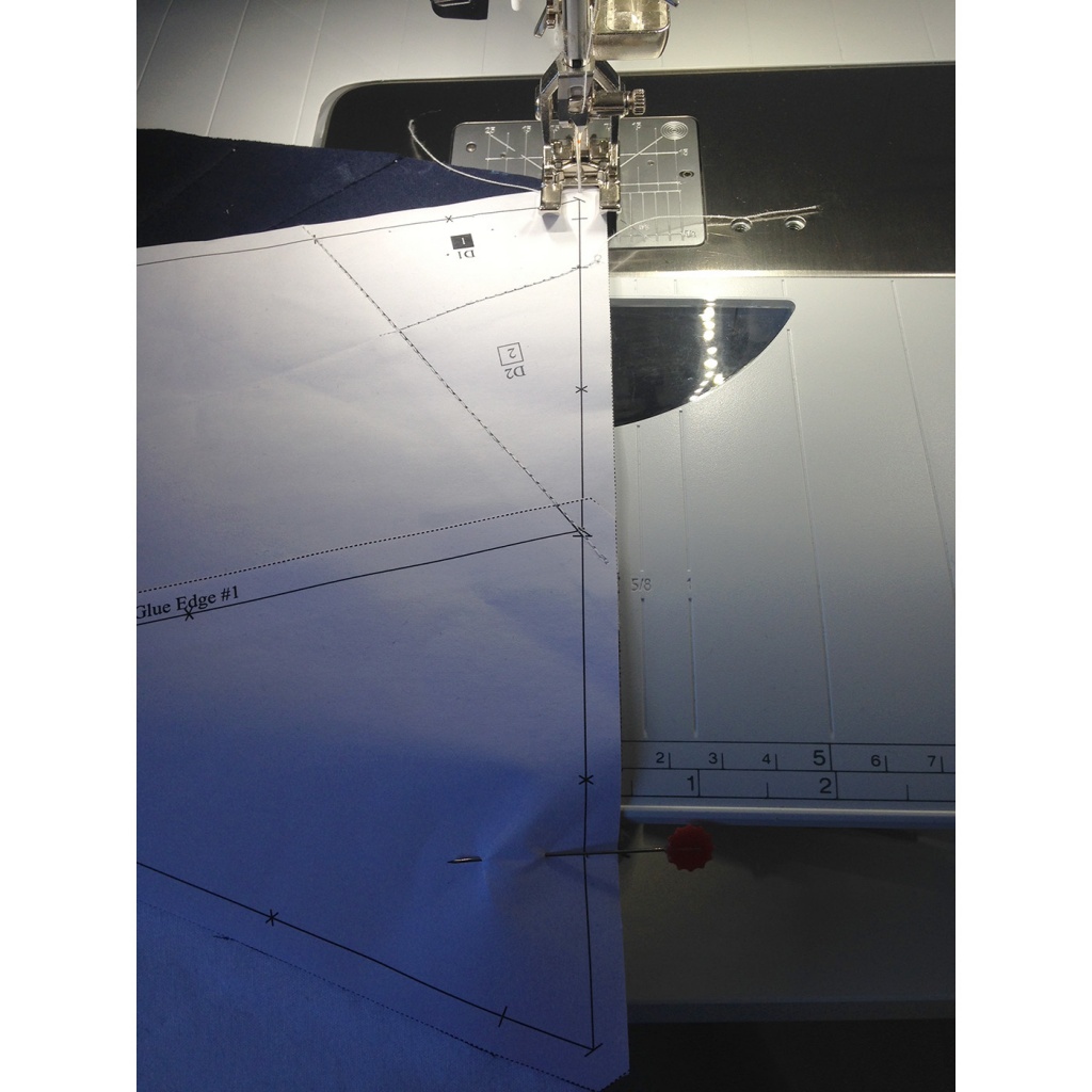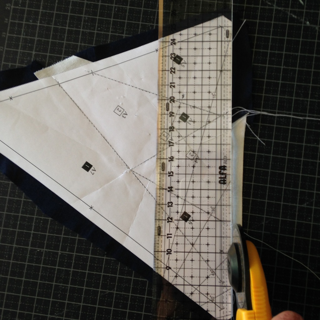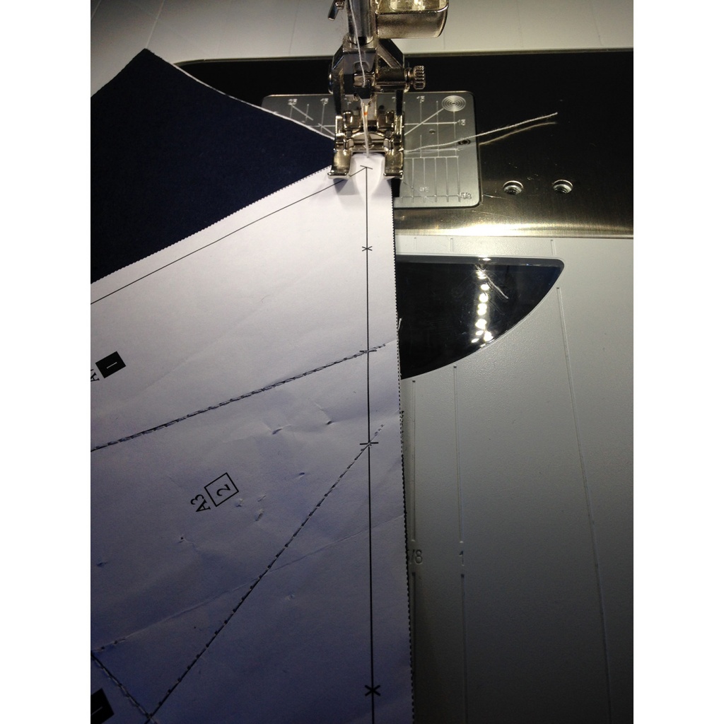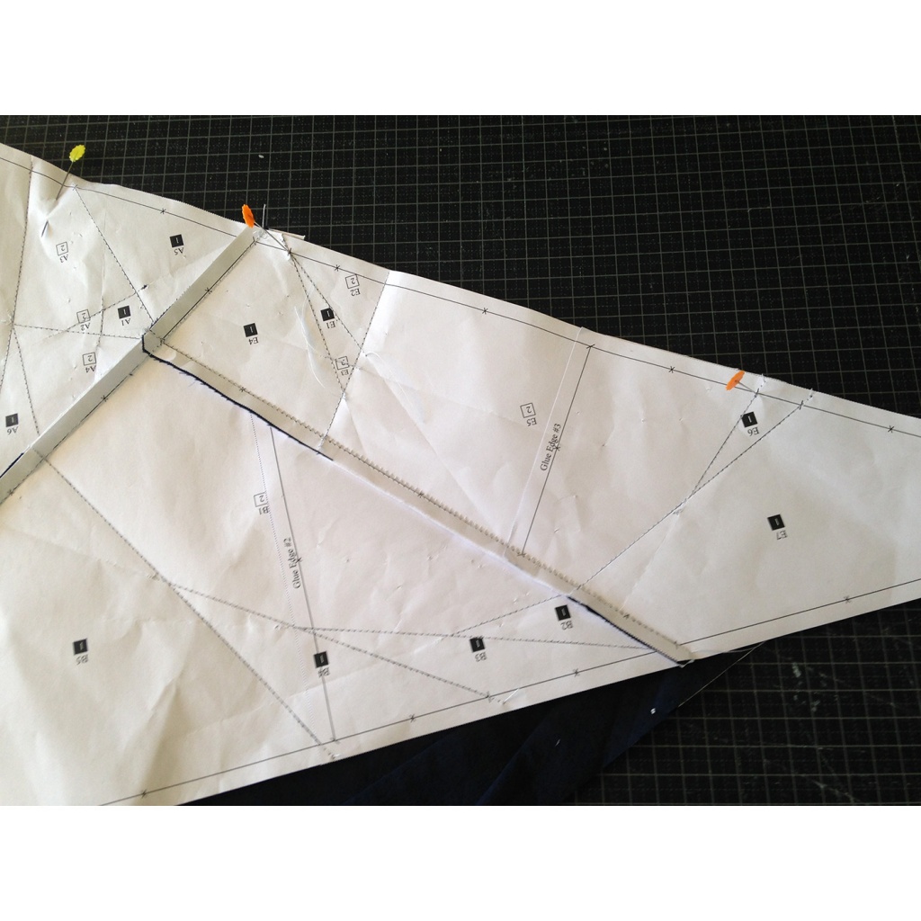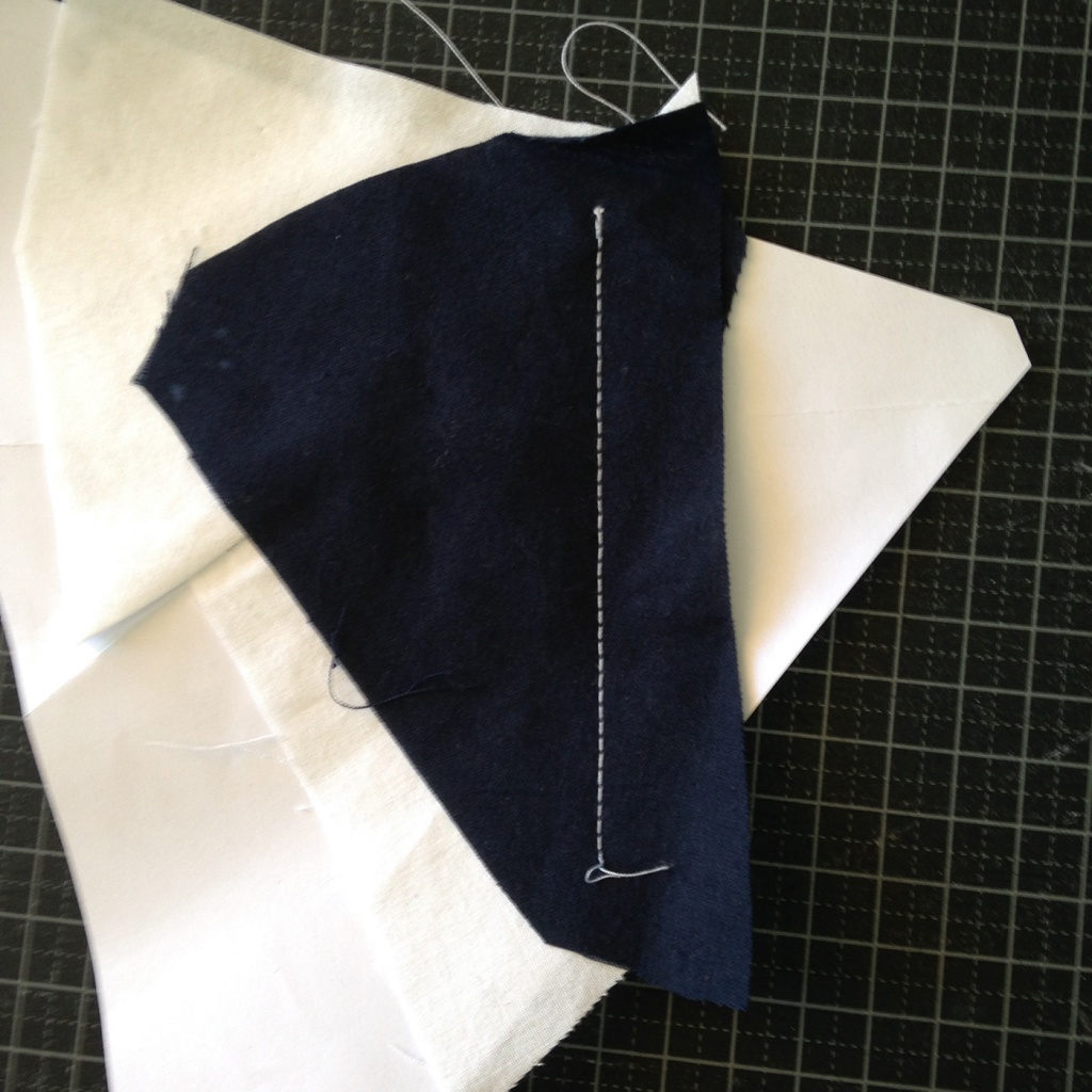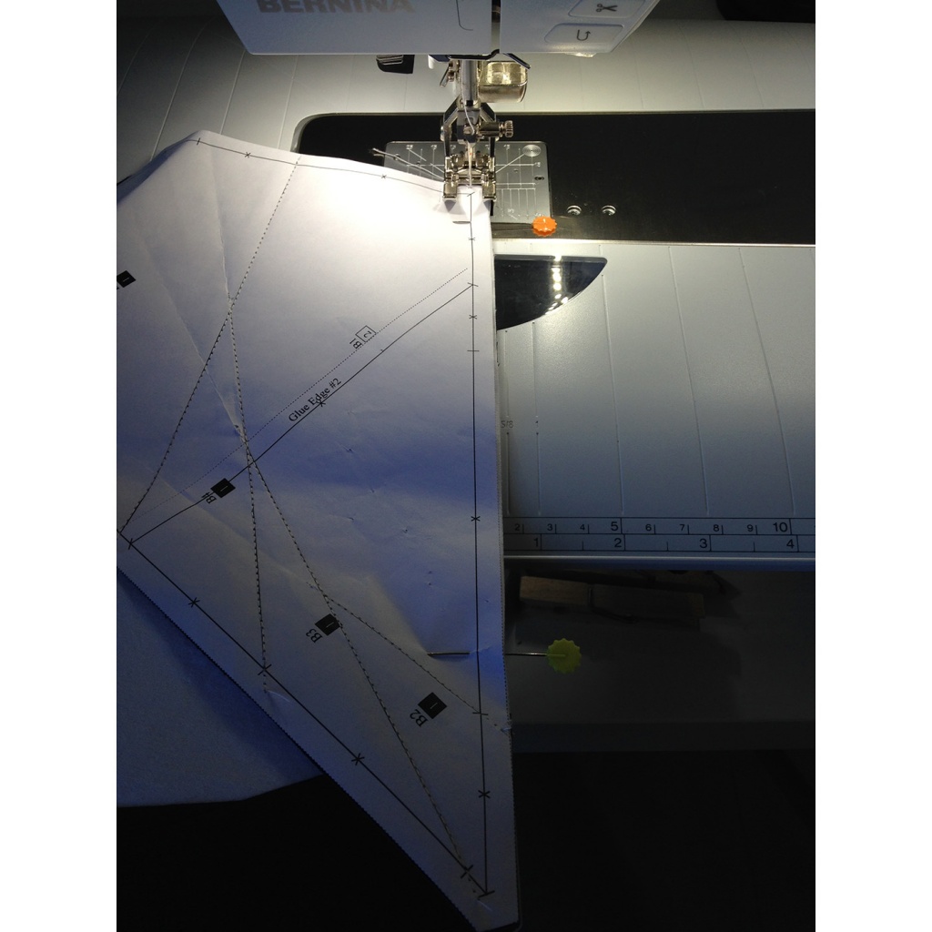 • Hacemos una costura en el papel sobre la línea que une A7 y A3-A6 y con las telas en la parte inferior.