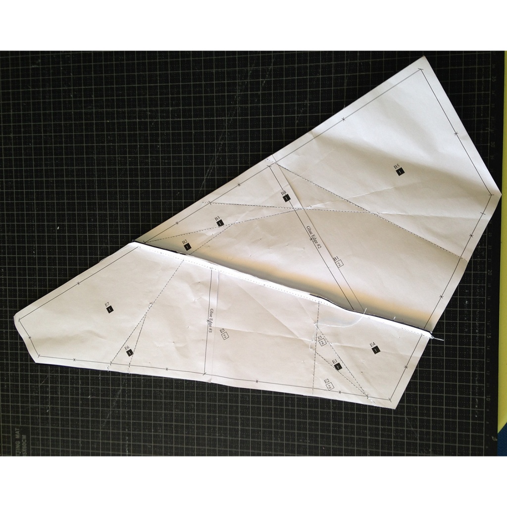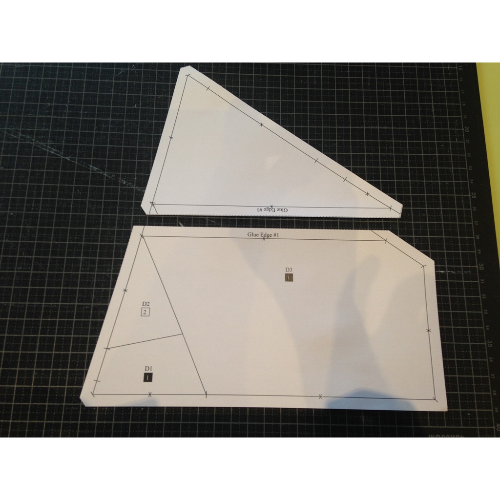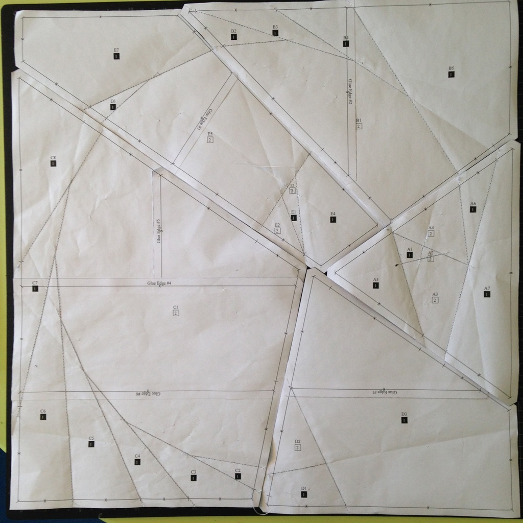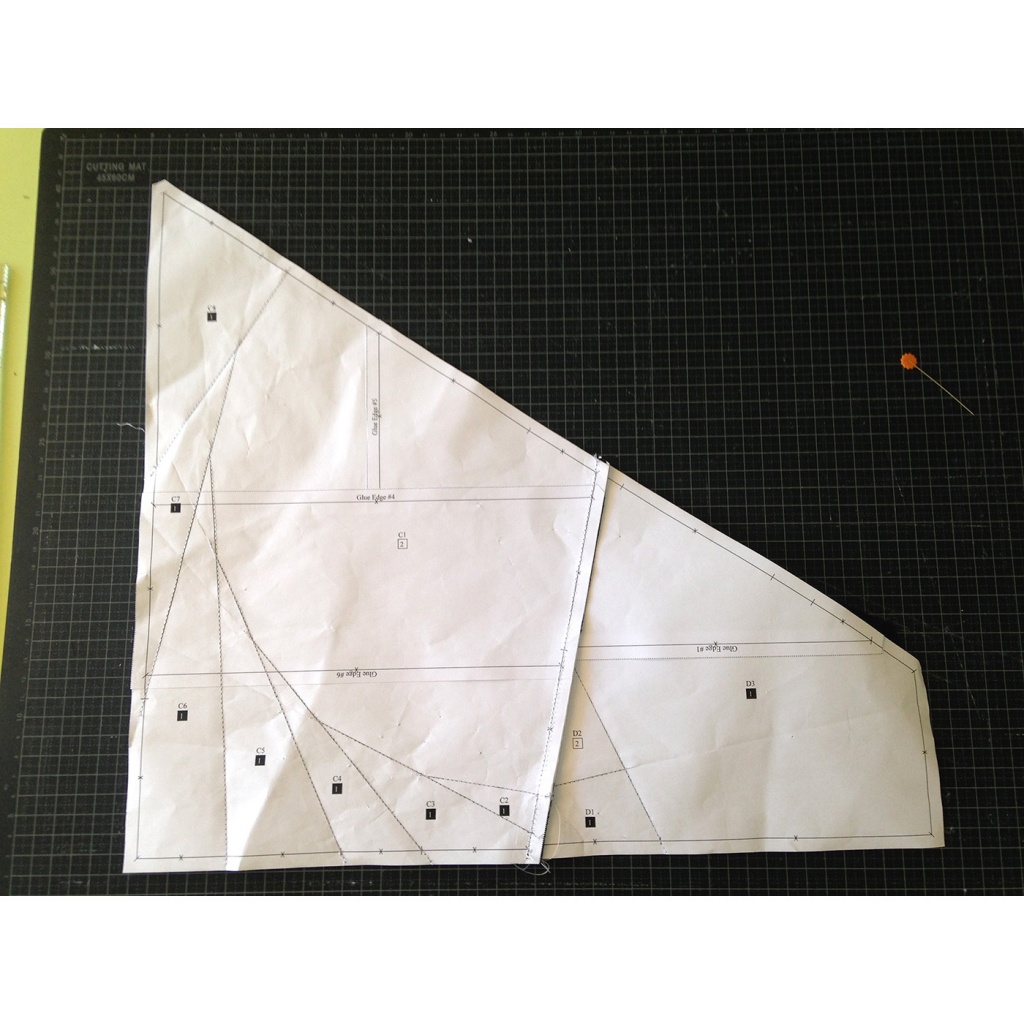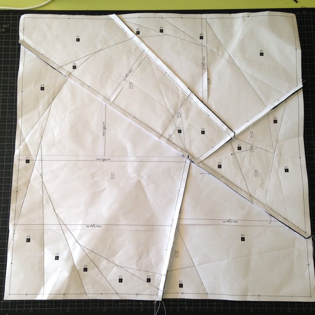 Verá que tanto en las piezas como en las plantillas algunos papeles tienen impreso “Glue edge # número”. Esto significa que debe localizar los dos papeles que dicen el mismo número y pegarlos entre ellos, mirando a trasluz que las líneas coincidan exactamente. Así obtendremos cada una de las secciones de patrón y las plantillas para las telas más grandes.