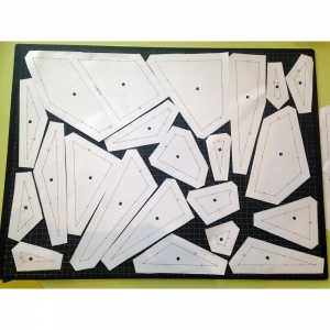 • Col·locam todas las plantillas del mismo color una junto a la otra a sobre la base de corte y la tela que queremos utilizar.