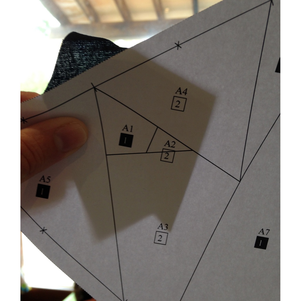 • Hacemos una costura en el papel sobre la línea que une A1-A2 y A3 con las telas en la parte de abajo. Fíjate que a una parte coge también A1, pero como la hemos puesto primero no hay problema. En esto consiste el patrón, nos dice el orden de las telas de tal forma que los podemos ir cosiendo a todas.