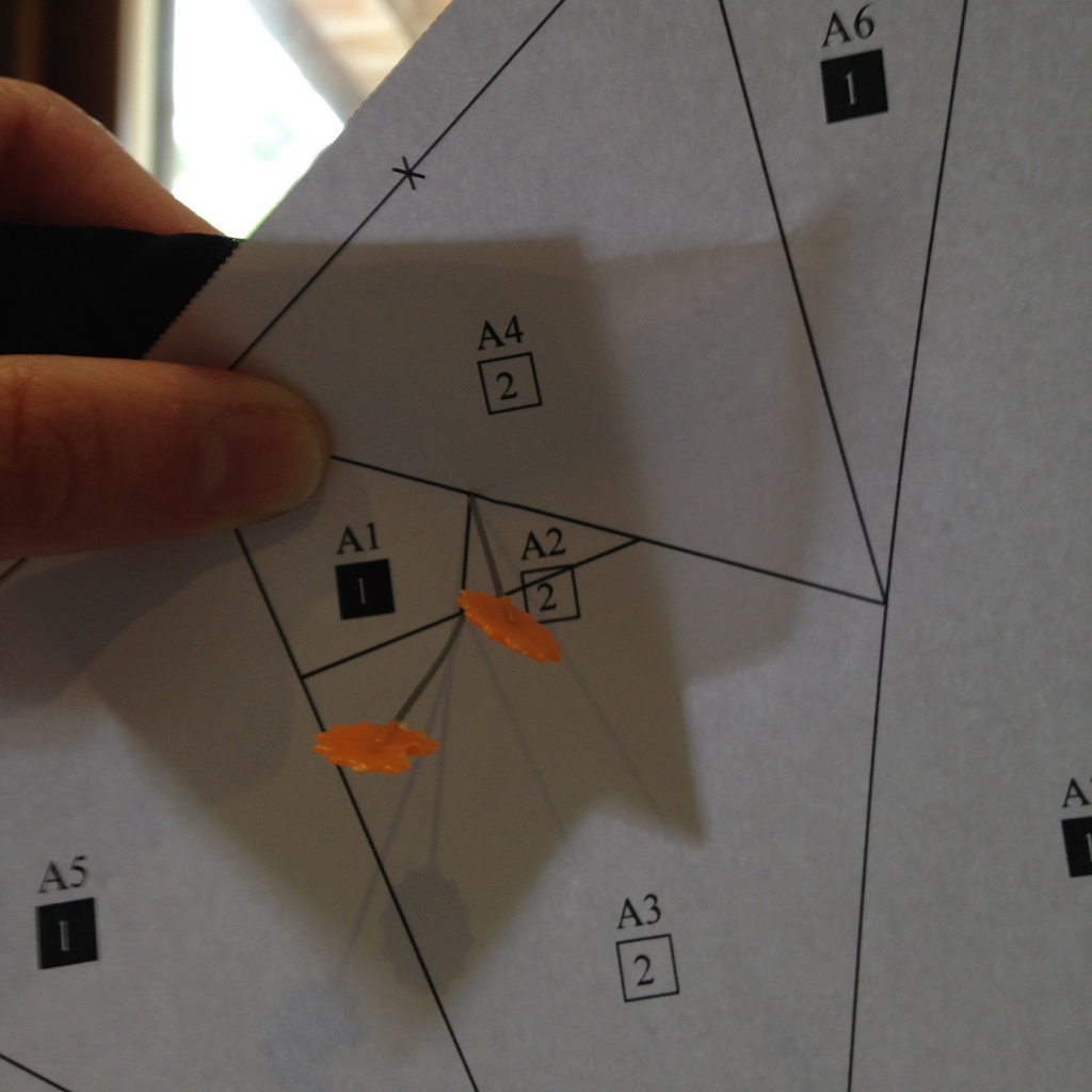 • Y ponemos agujas en cada uno de los extremos de la línea que hay entre la figura A3 y A4. Véase que esta línea incluye A1 y A2, pero como hemos comentado es normal. El problema sería si incluyera algunas de las figuras posteriores, de A5 a A7.