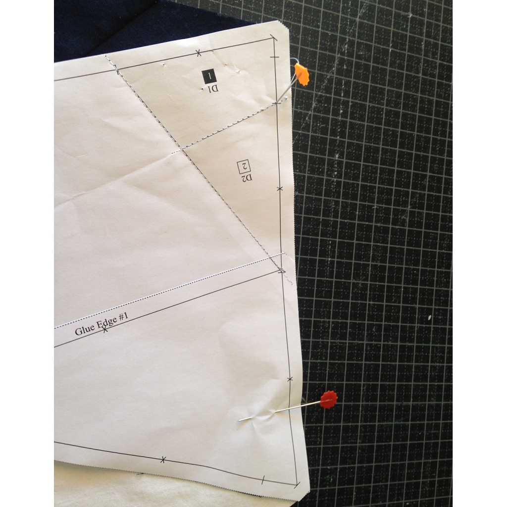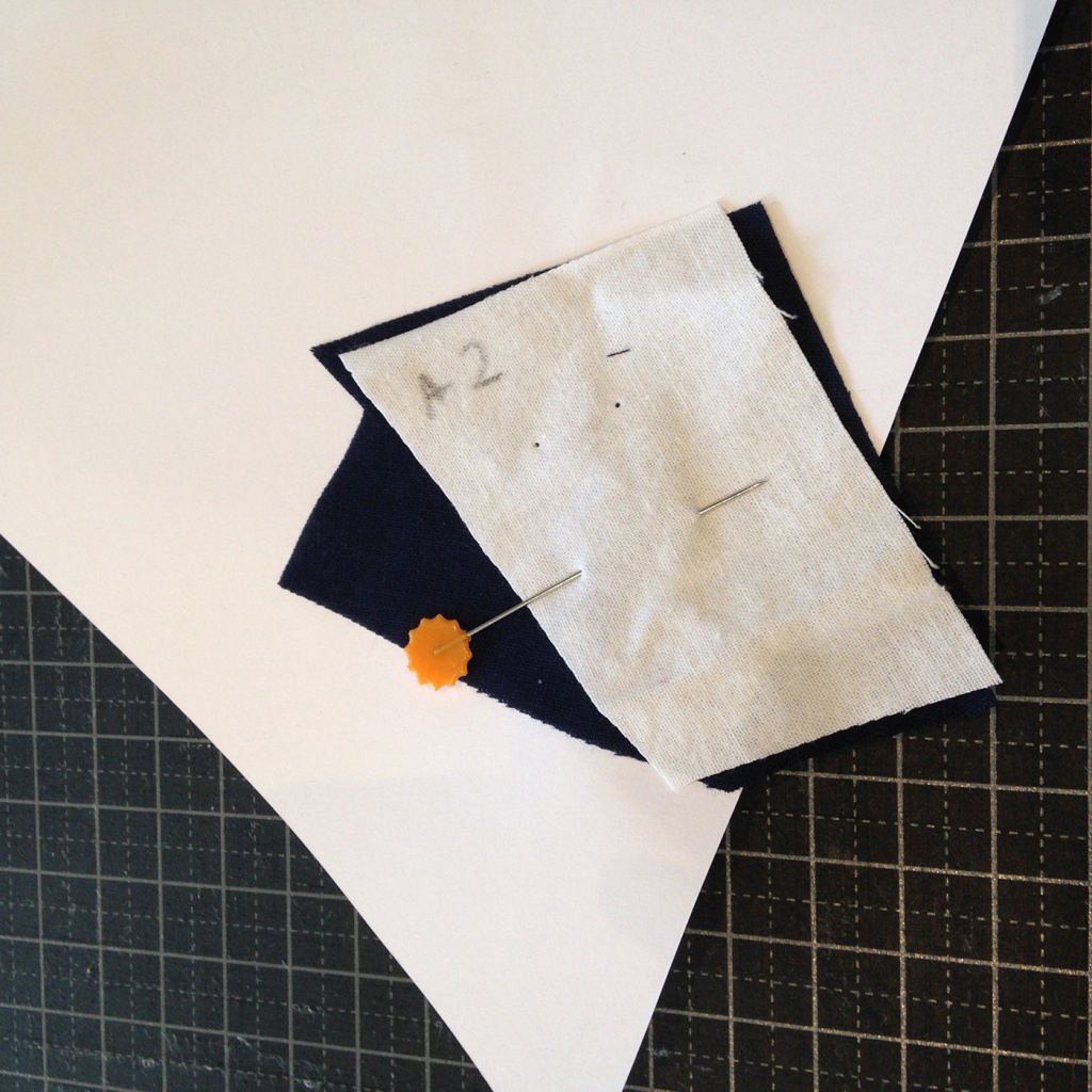 • Fijamos con agujas las dos telas al papel, teniendo cuidado que la aguja no pase por la línea que une A1 y A2.