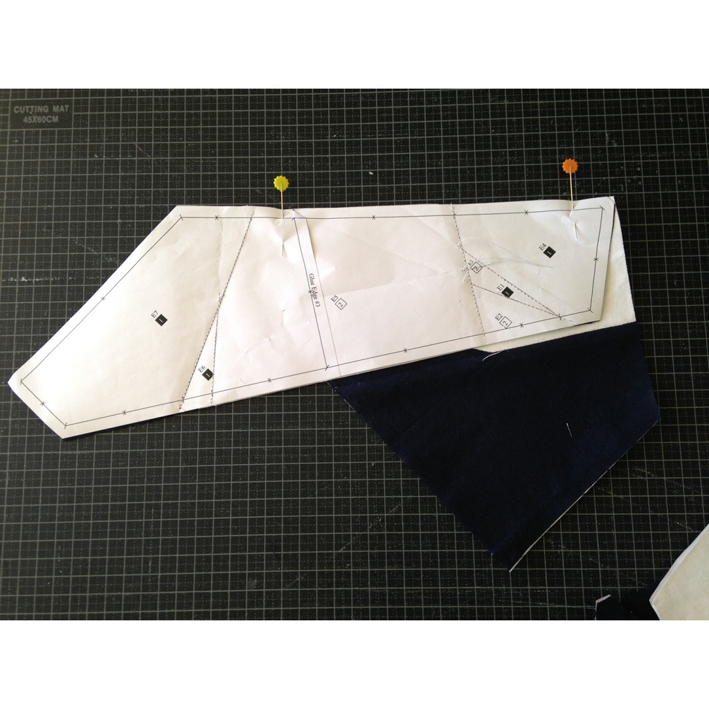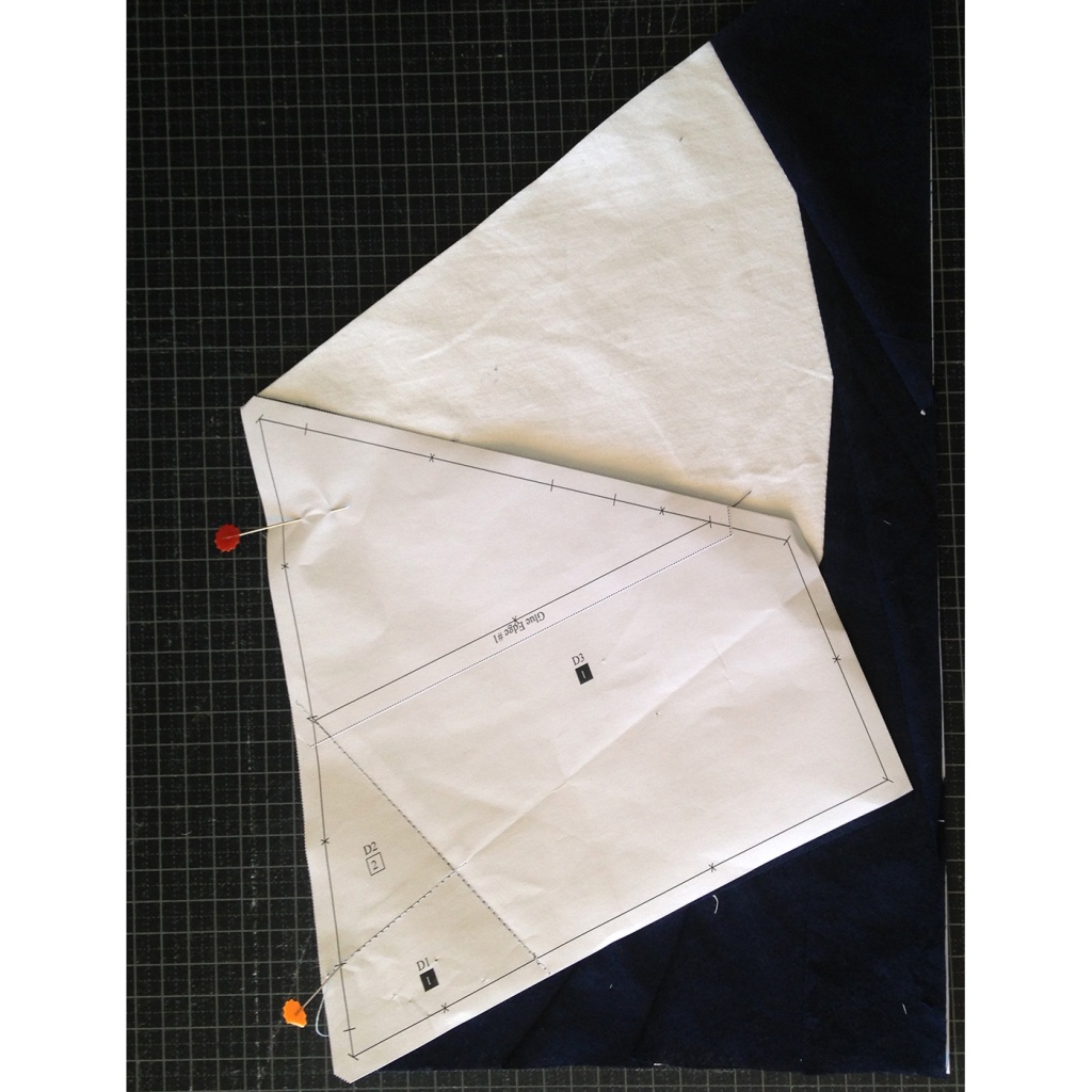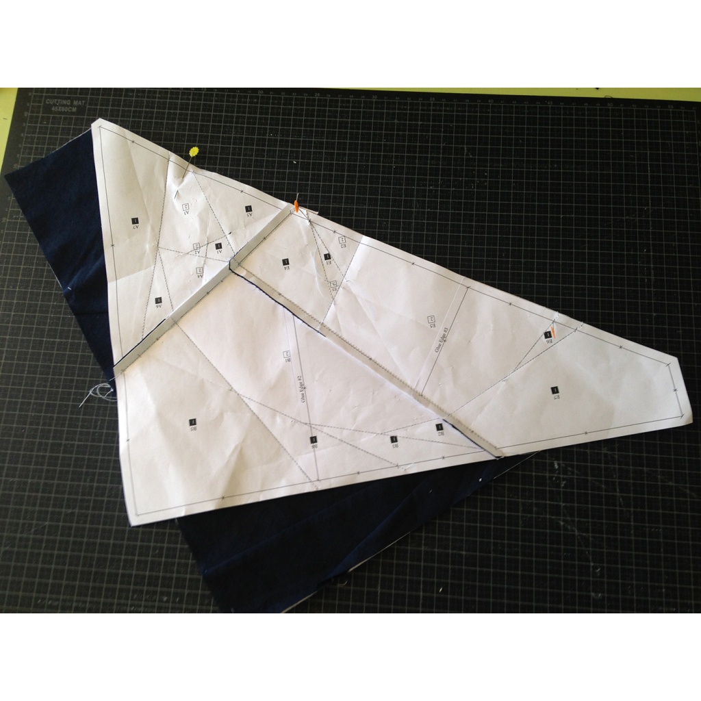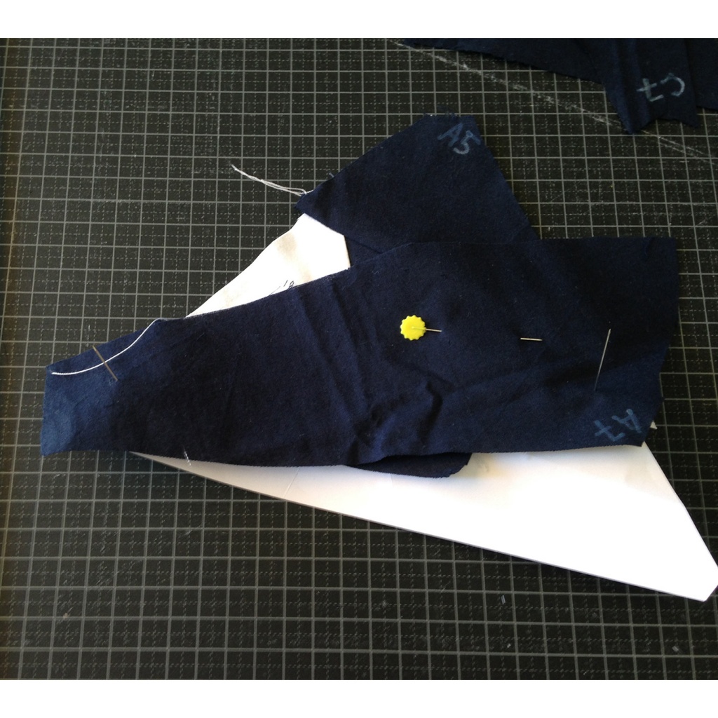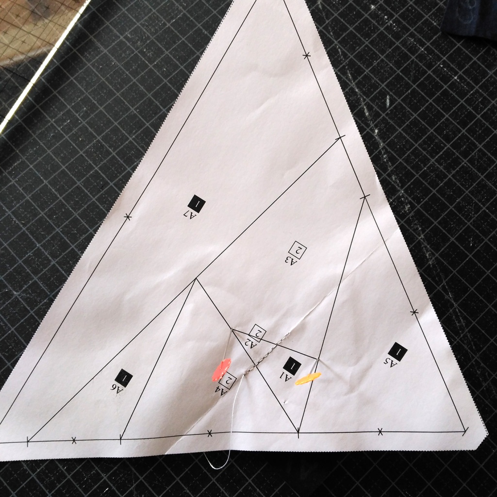 • Fijamos con agujas la tela al papel, yendo con cuidado que la aguja no pase por la línea que une A1-A2 y A3.